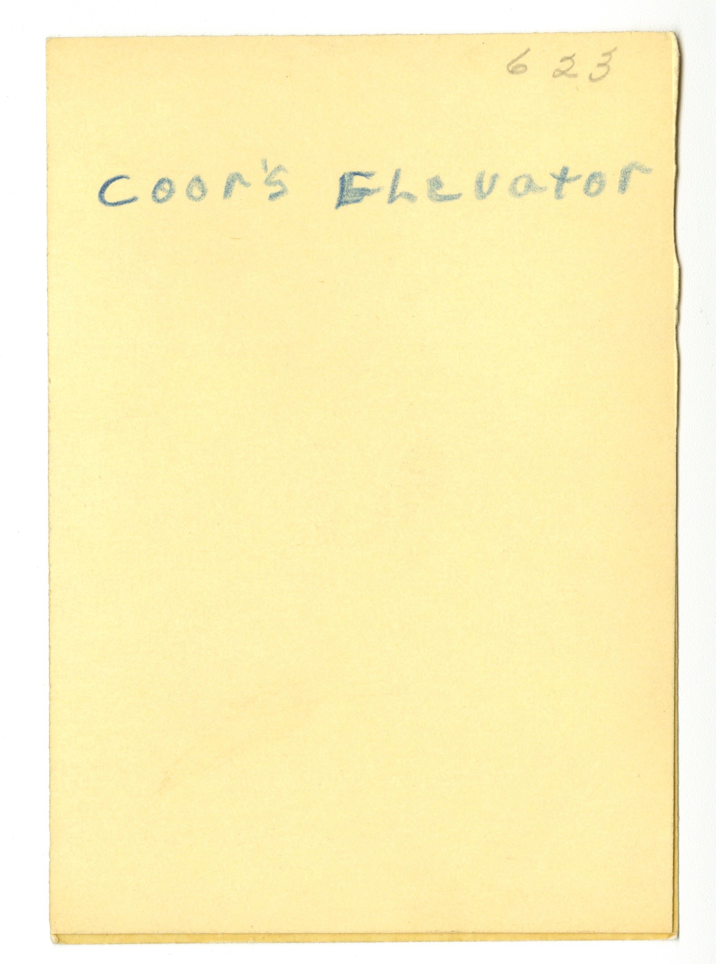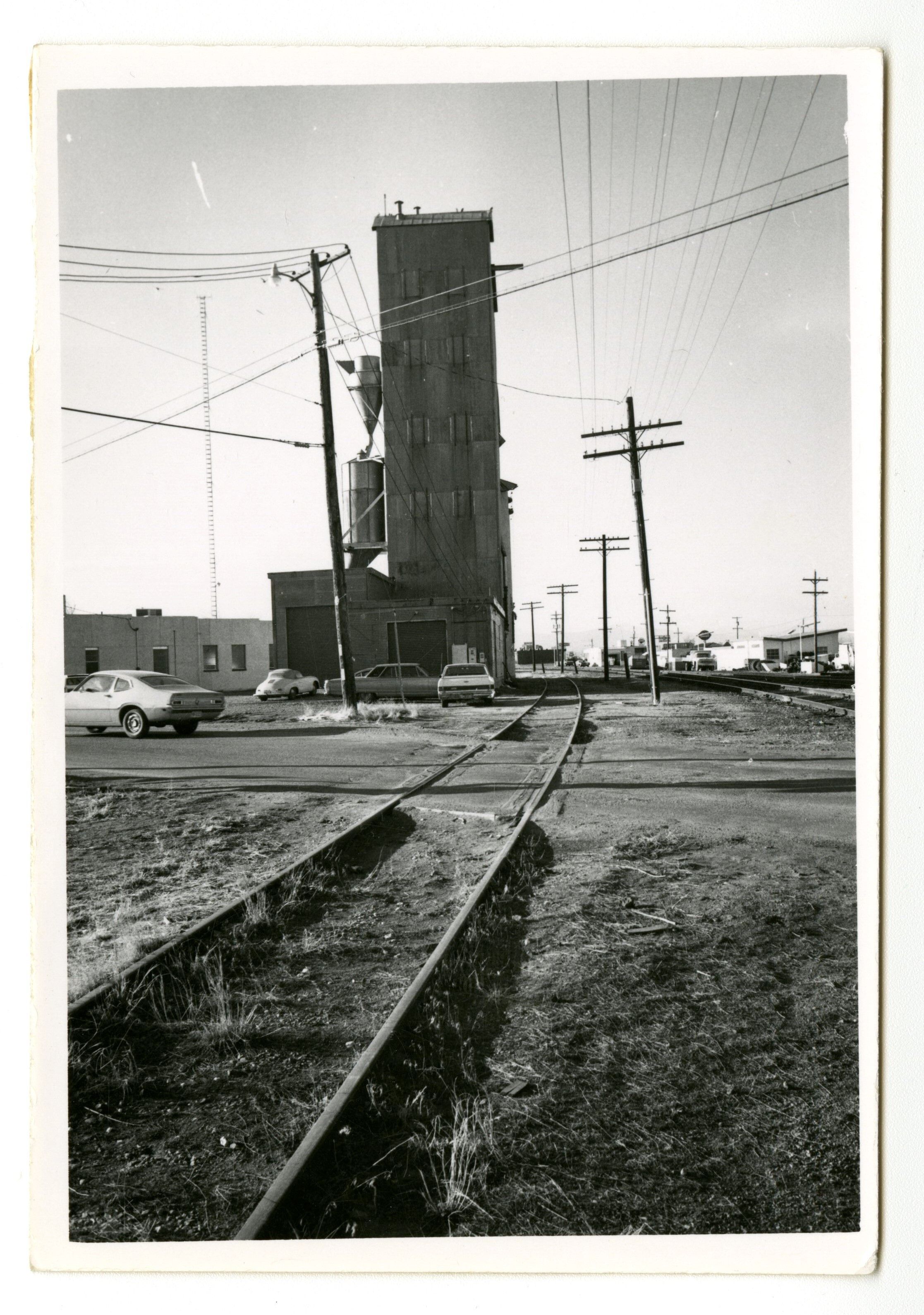 Photograph, black and white. Coors elevator in Broomfield. Date range determined by style of cars. Train tracks are visible with cars in parking lot that appear to date from the 1970s.