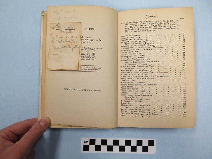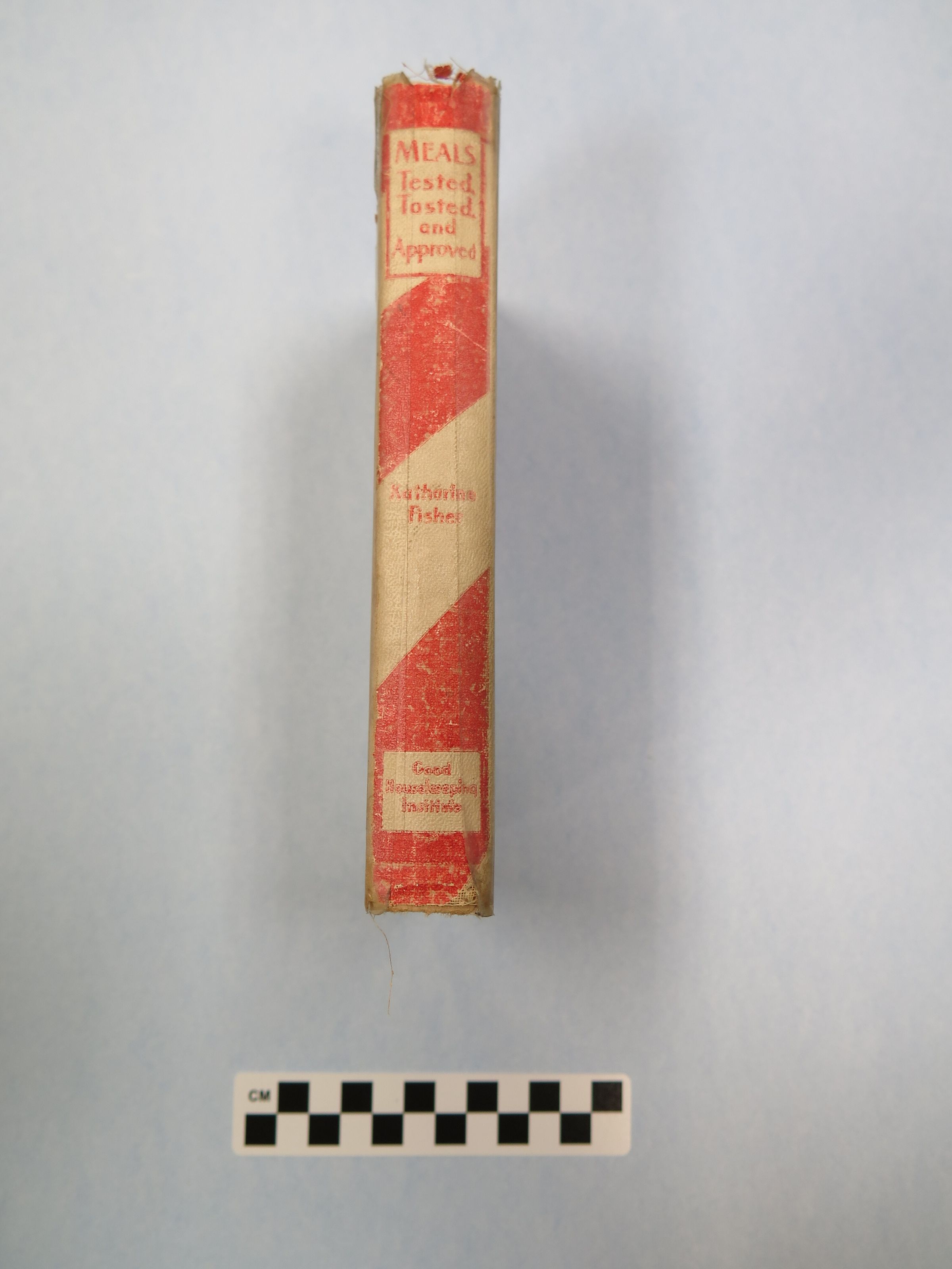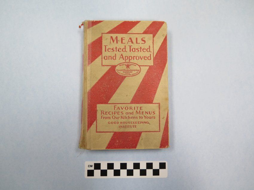 A 7.5"(h) x 5"(w) x 1"(d) hardcover book with 256 pages. The front cover and spine are striped red and tan. Spine has been taped together. Two 2"(w) x 3"(h) pieces of paper with a handwritten recipe for hot cocoa are pinned to the back of the title page. An inscription in ink on the front free endpaper says "To Lucille/from Aunt Isabel/1932/Where is the man/ who can lived without cooks-"Collection