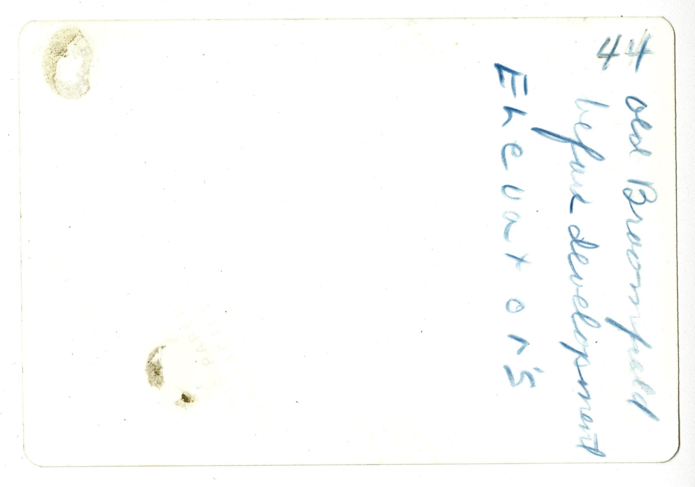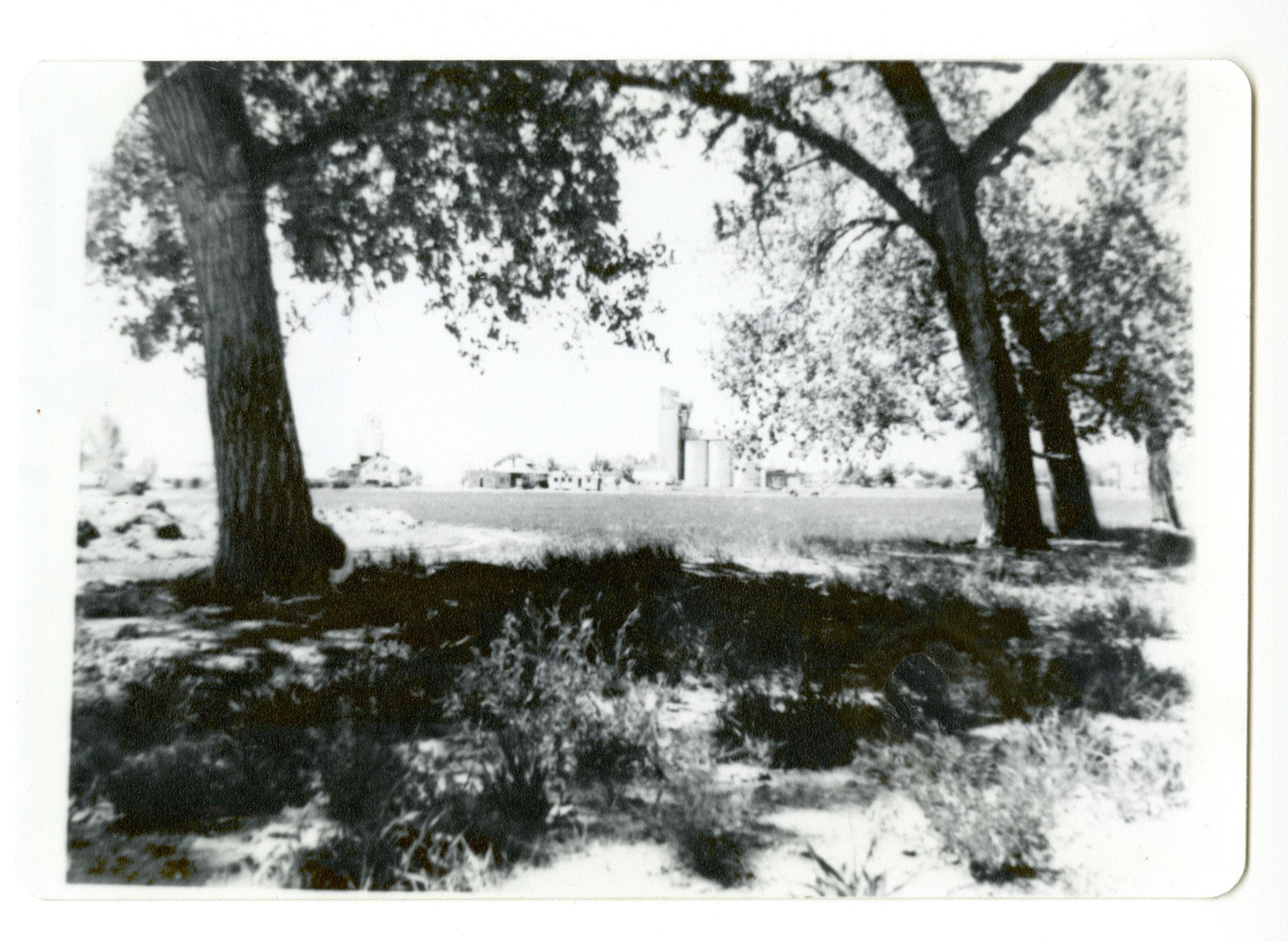 Photograph, black and white. Trees framing grain elevators and other buildings, grass in foreground. Caption on back reads: "Old Broomfield before development. Elevators." Early 1950s.