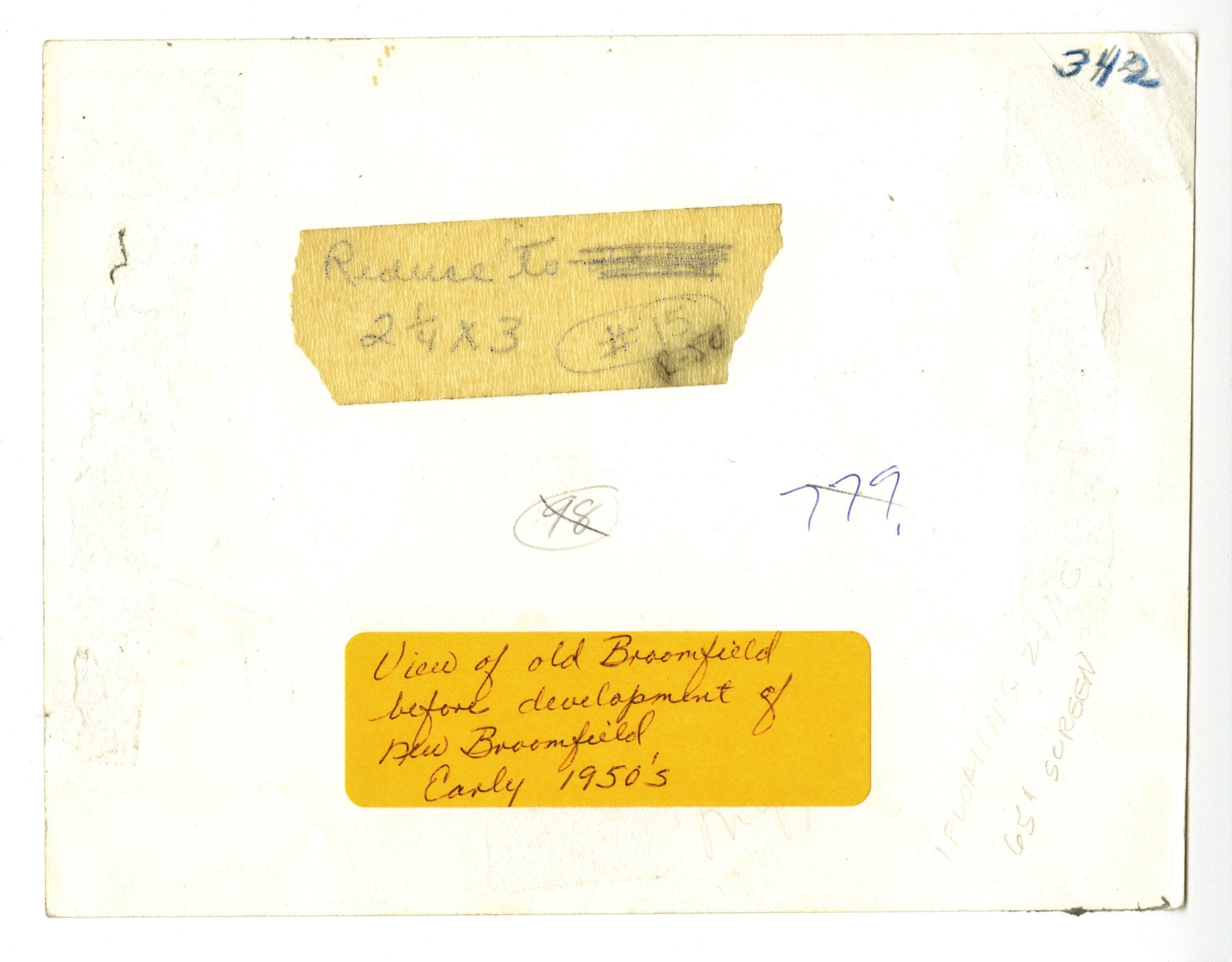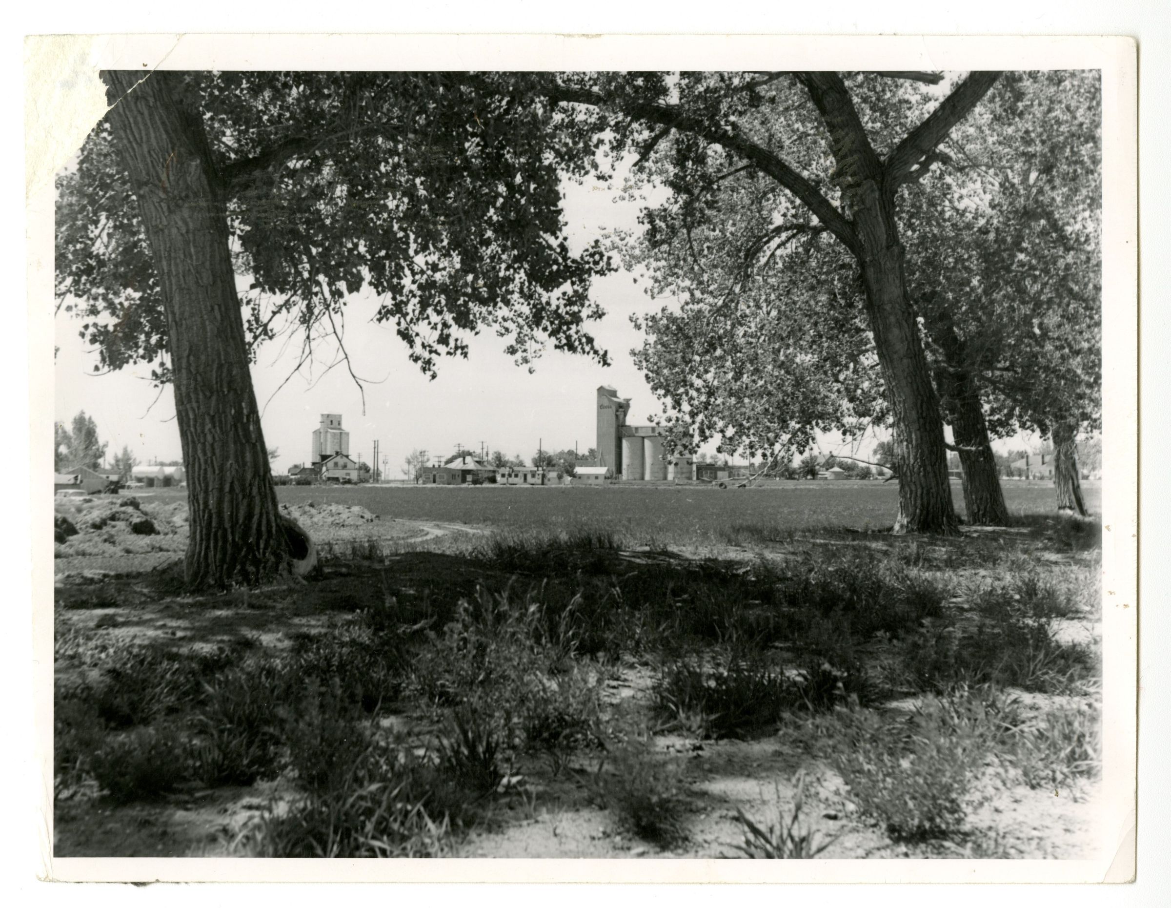Photograph, black and white. Trees framing grain elevators and other buildings, grass in foreground. Caption on back reads: "View of old Broomfield before development of new Broomfield. Early 1950s."