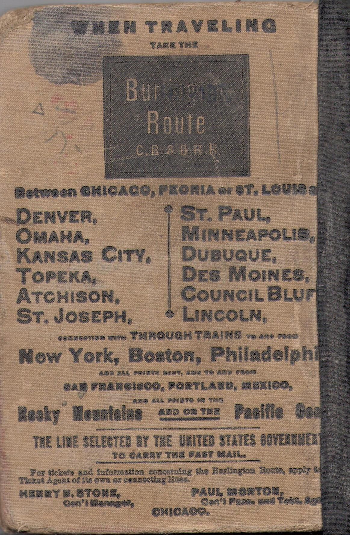 This is a 4" x 5 3/4" hard cover book with 318 pages. The cover is light brown with letters in black font. There is black cloth tape on the spine. On the cover below title is the text "Compliments of the Passenger Department/ Burlington Route." Stamped in purple ink on the inside of the front and back covers are "Cain Caywood" and "Boulder, Colo." On the first page written in script in pencil are the names "Clyde Hale" and "Crain Caywood."Collection
