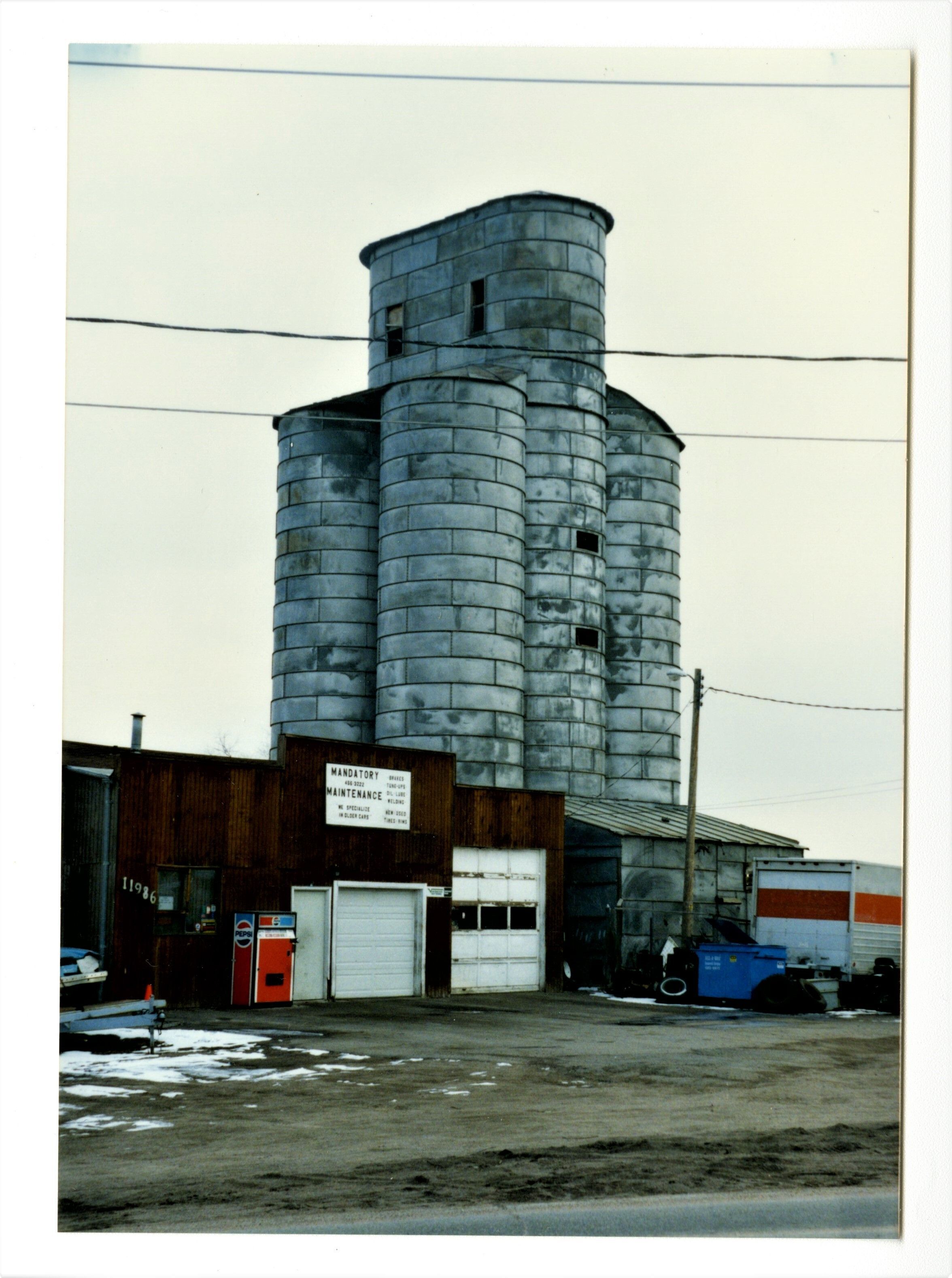 Photograph, Broomfield elevator behind garage. Jefferson County