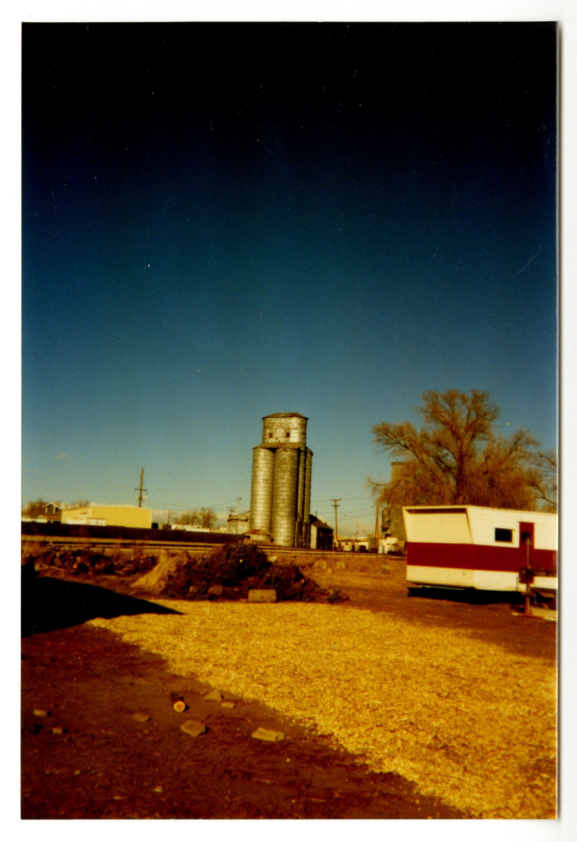 Photograph, color. Distant shot of grain elevator. With travel trailer in foreground.