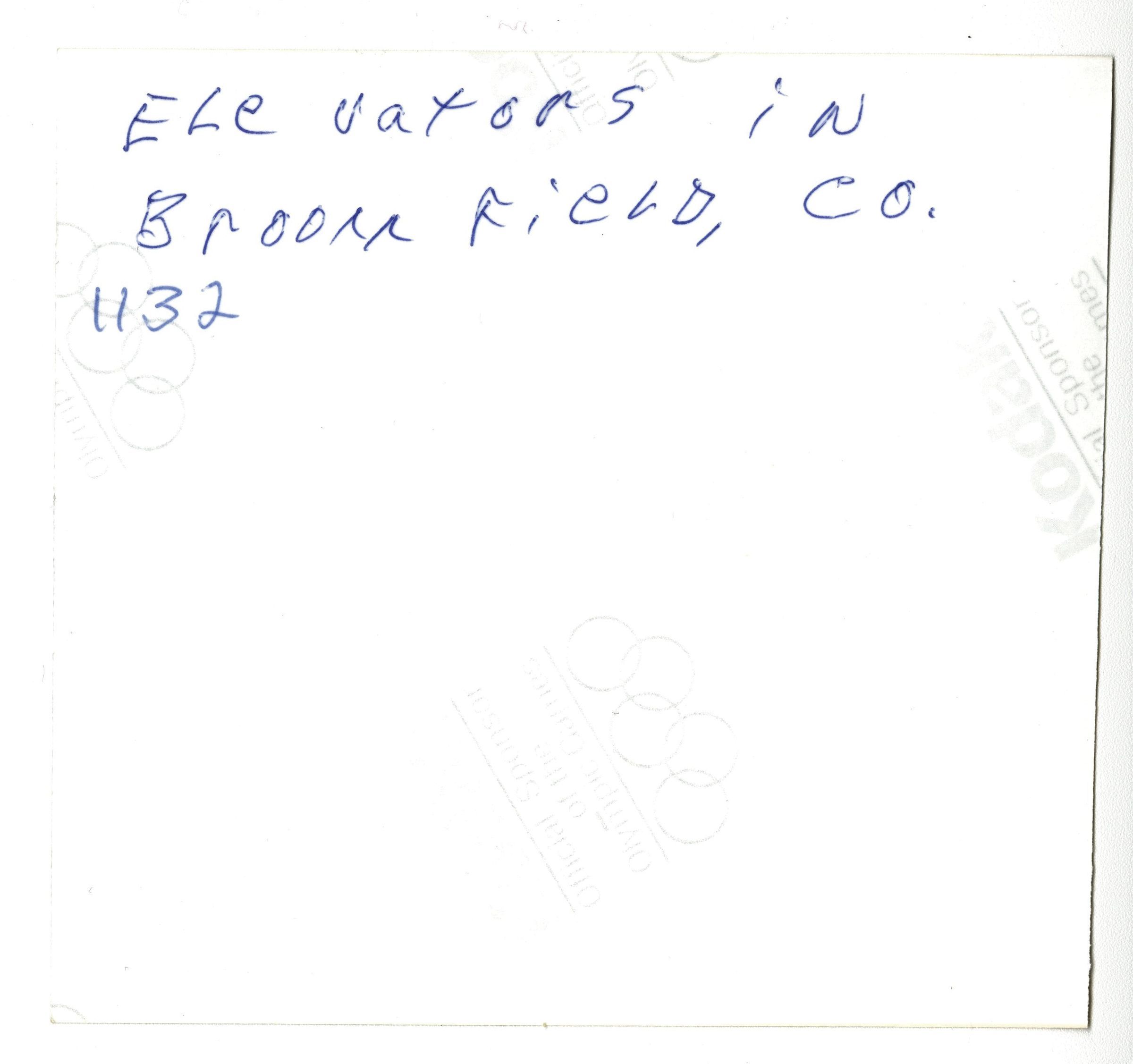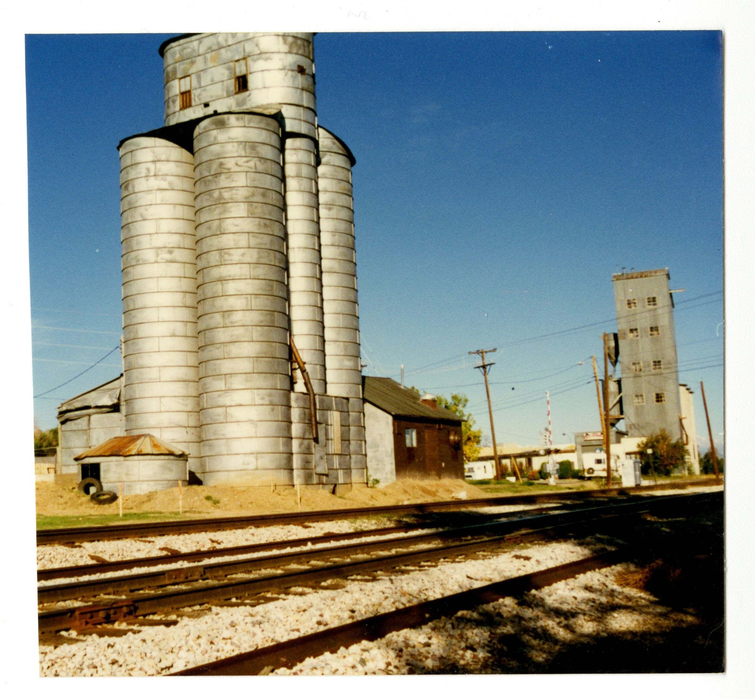 Photograph, color. Elevator with train tracks in foreground.