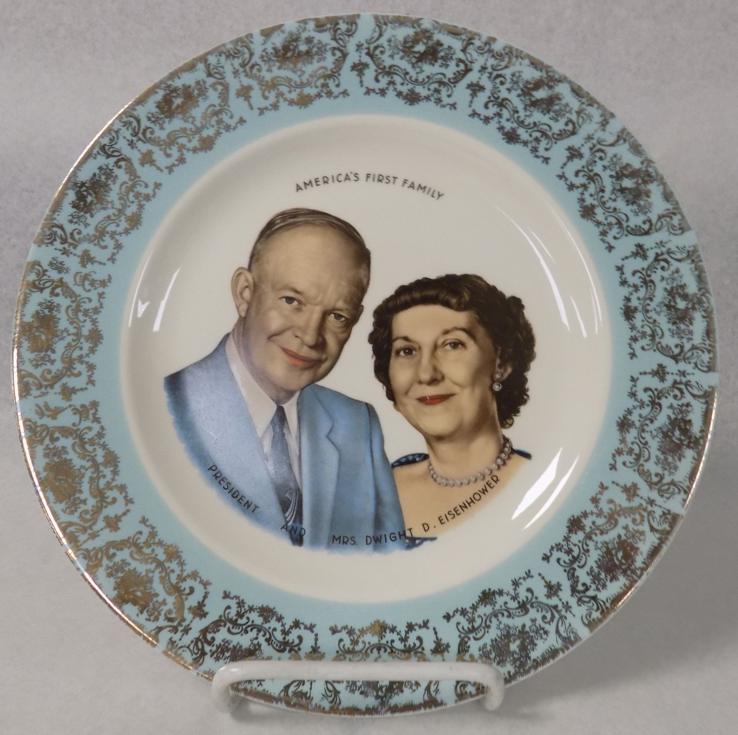 Item is a decorative plate featuring an image of former president Dwight Eisenhower with his wife Mamie. Their image, with Eisenhower wearing a blue suit and tie and Mamie wearing pearl jewelry, is featured in the concave portion of the dish framed by the words "America's First Family" and "President and Mrs. Dwight D. Eisenhower." The outer rim of the plate is painted light blue with a golden patterned overlay. The back of the plate is blank.