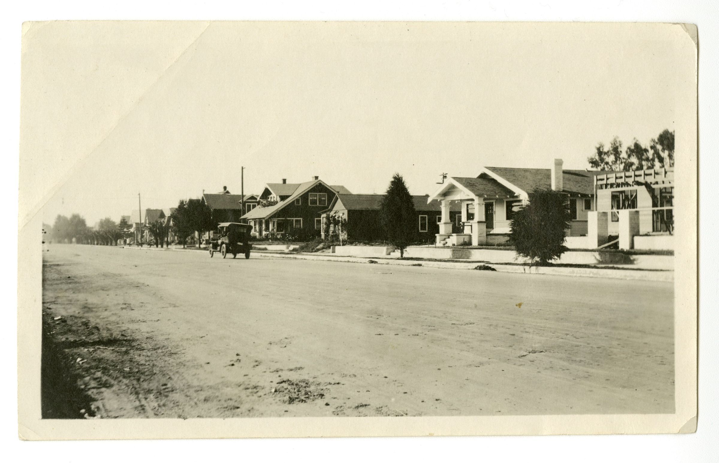 Photograph, black and white, of an unknown street, with a car and several houses. Possibly a street in Denver?