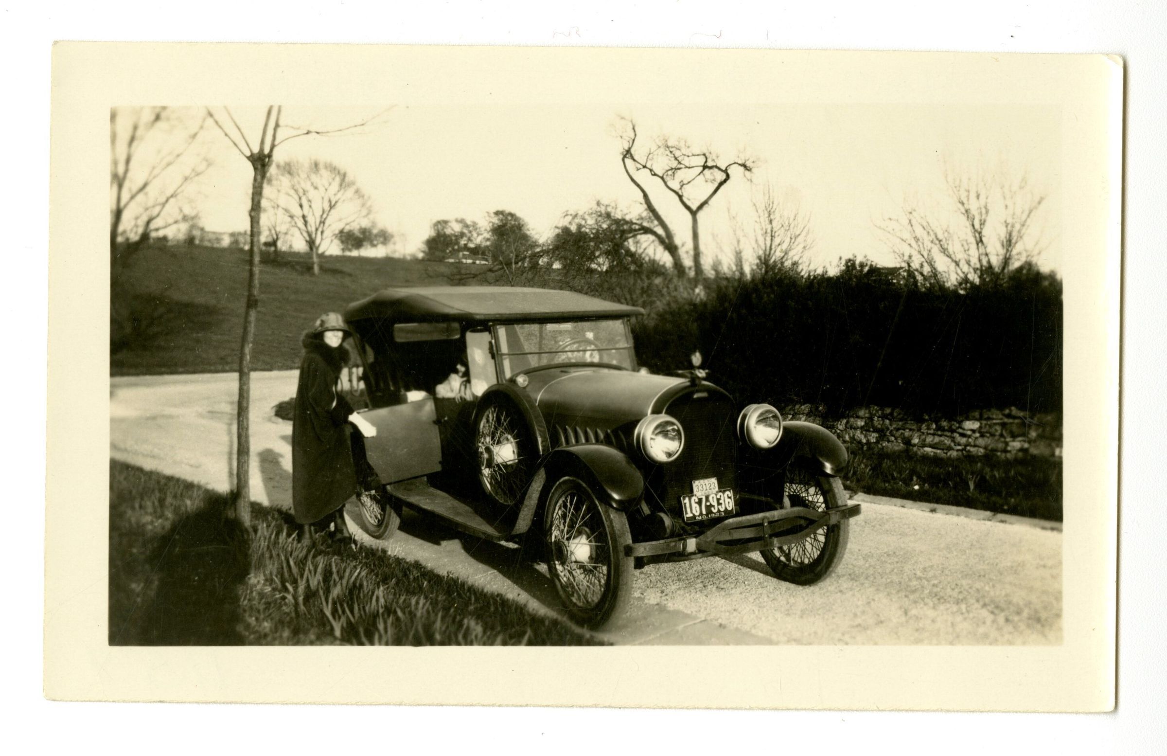 Photograph, black and white. Lady with car. Plate: Missouri 167936