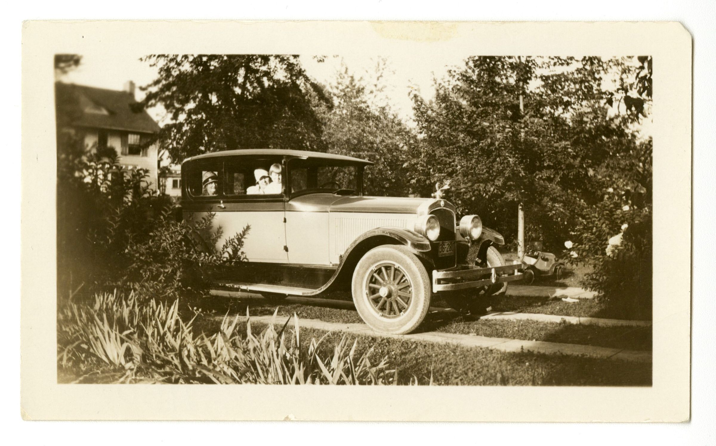 Photograph, black and white. Lady and children in a car (1932 Chrysler). Two woman one child