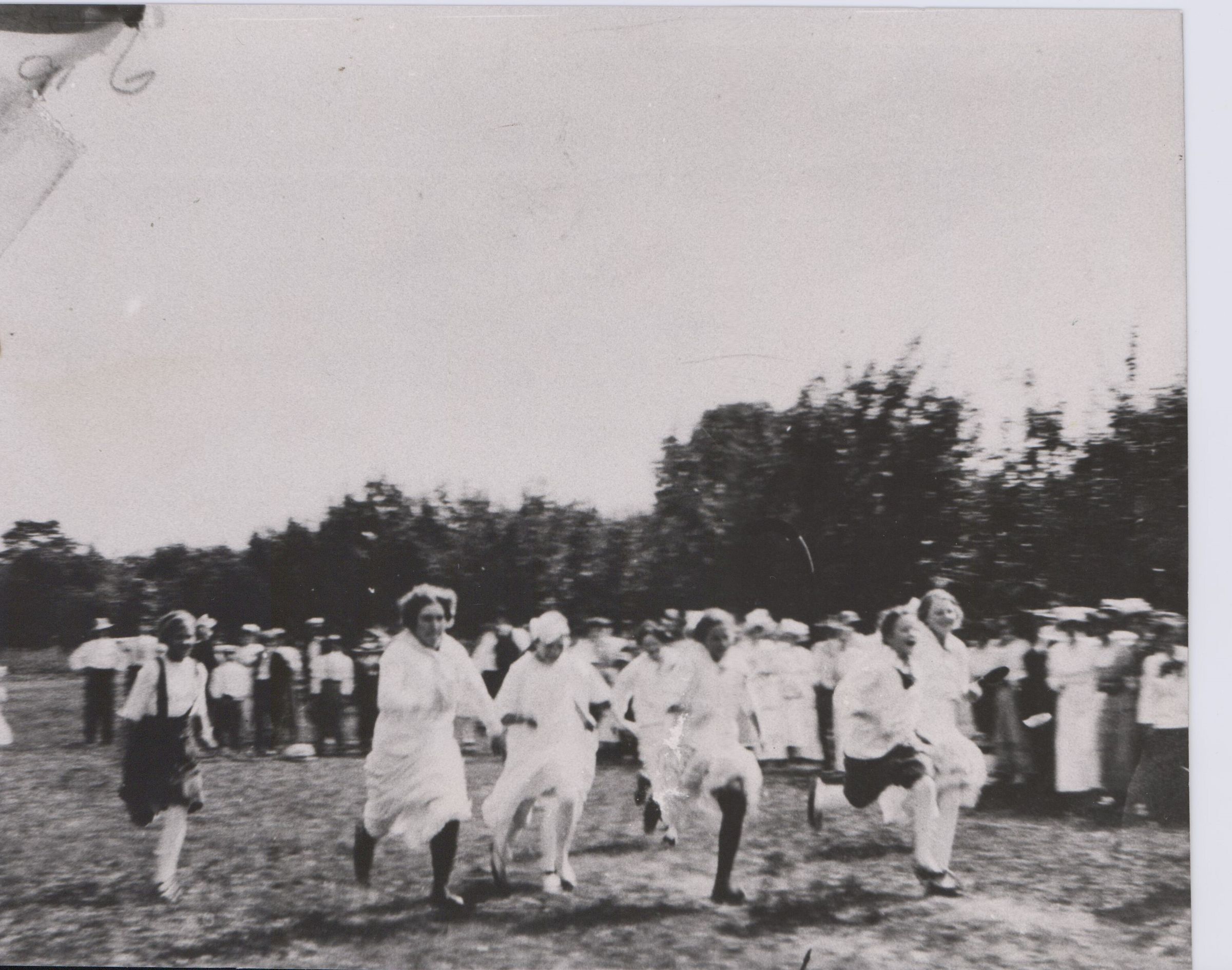 Appears to be a footrace between women and girls, with specatators behind them. Wooded in background.Collection
