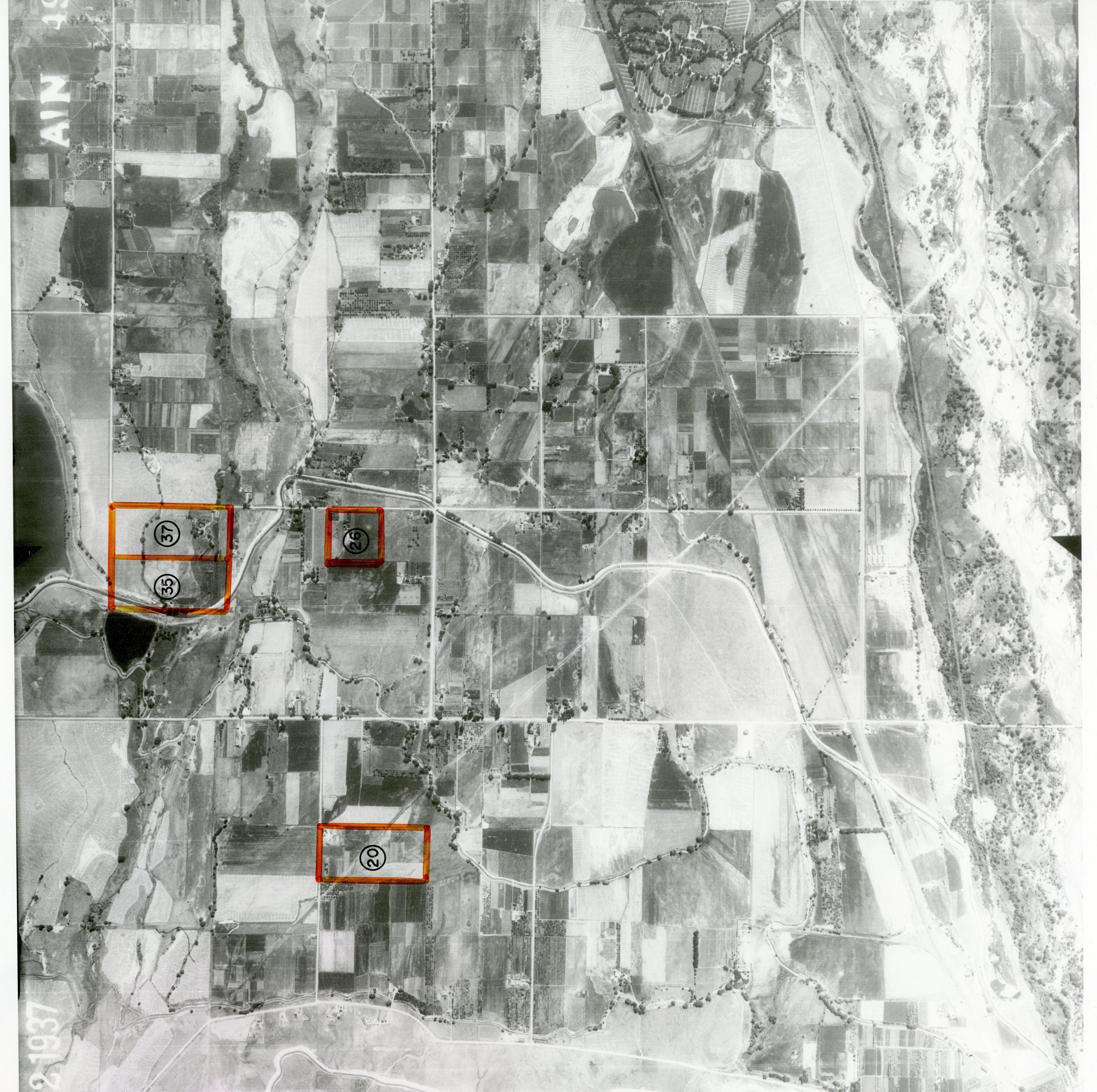 Item is a black-and-white aerial photograph of Broomfield taken on July 22, 1937. The code "AIN 49 21" is present in the top right corner. Some areas of the map are numbered, and their borders are highlighted by an orange marker. Youngfield Street is labeled intersecting 44th Avenue, and Mount Olivet Cemetery is labeled on the side with black pen. Attached to the map by a piece of red ribbon is a notice from the General Services Administration from the National Archives and Record Service confirming that the document is correct. It was signed by Charles E. Taylor, Acting Chief at the Center for Cartographic and Architectural Archives, on November 19, 1980. This paper is also marked with a bright orange seal.Photograph Details