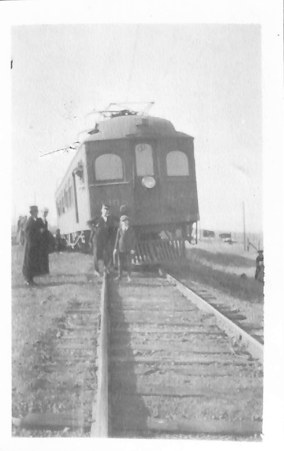 Photograph of the Kite Route Trolly derailed in 1920, taken by Charles Shunk Sr., station agent. Burns Junction.