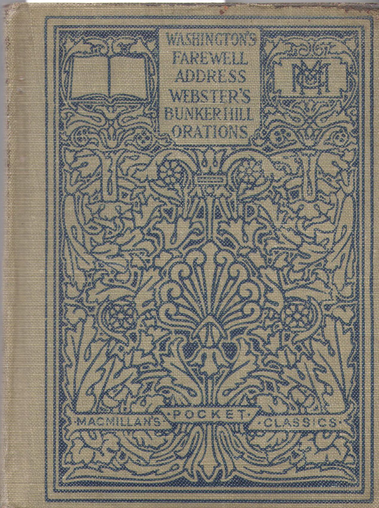 This is 4 1/2" X 5 3/4" hardcover book with 131 pages. The green cover has a dark blue design on the front. Title on cover and on title page says "Washington's Farewell Address and Webster's Bunker Hill Oration." There are extensive notes in pencil on the inside of the cover and some notes in ink on the inside of the back cover.
