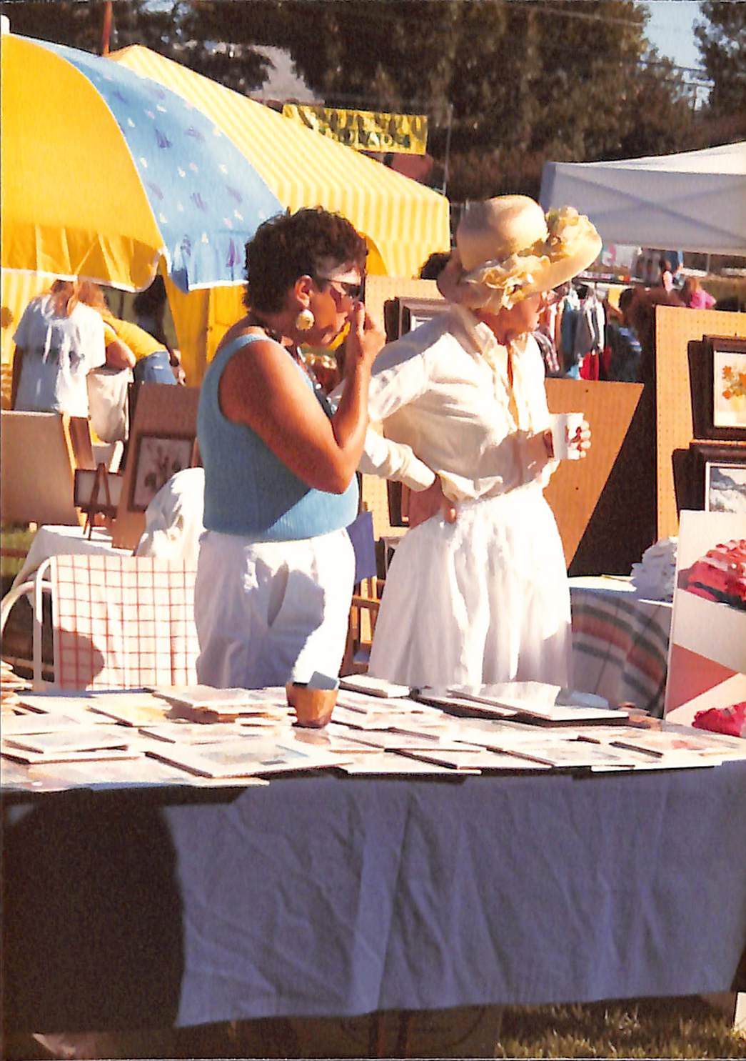 Item is a photograph taken on Kodak paper of the 1989 Broomfield Days. Two women, one of them Sandy Bremek (?), standing in front of a table with a navy tablecloth over it. The one on the left is wearing a blue tank top and white pants, and she appears to be plugging her nose. The woman next to her is wearing a flowery yellow hat and white dress, with one hand on her hip and the other holding a drink. They are both looking towards the right. A yellow and blue umbrella covers the booth behind them, and on the table is a series of frames, possibly housing art or photographs.Photograph Details