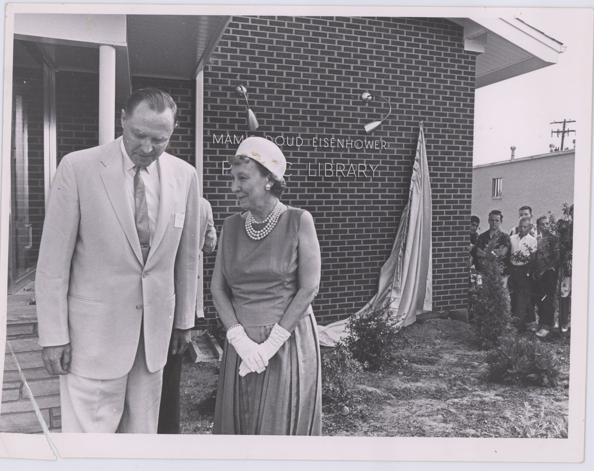 Mamie Doud Eisenhower and an unidentified man in a light suit standing in front of the new library at 12 Garden Center on the day of the dedication for the Mamie Doud Eisenhower Library on July 7, 1963. Behind them is the building and its sign (since removed) and the curatin that must have been used for the unveiling. A group of boys pier behind the building on the right.