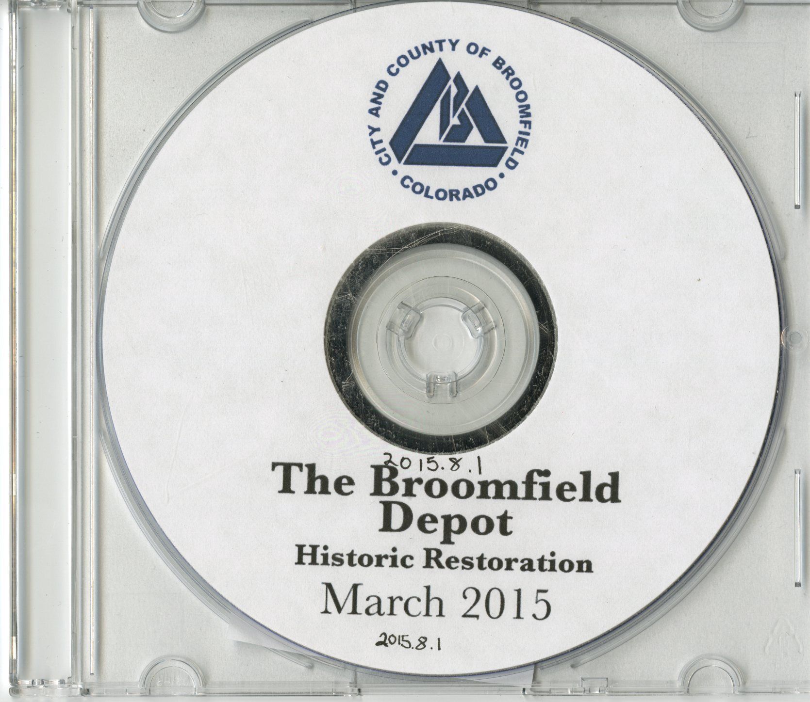 There is a DVD and a case. The DVD is white and has black text and a blue logo of the City and County of Broomfield. The case is clear plastic.