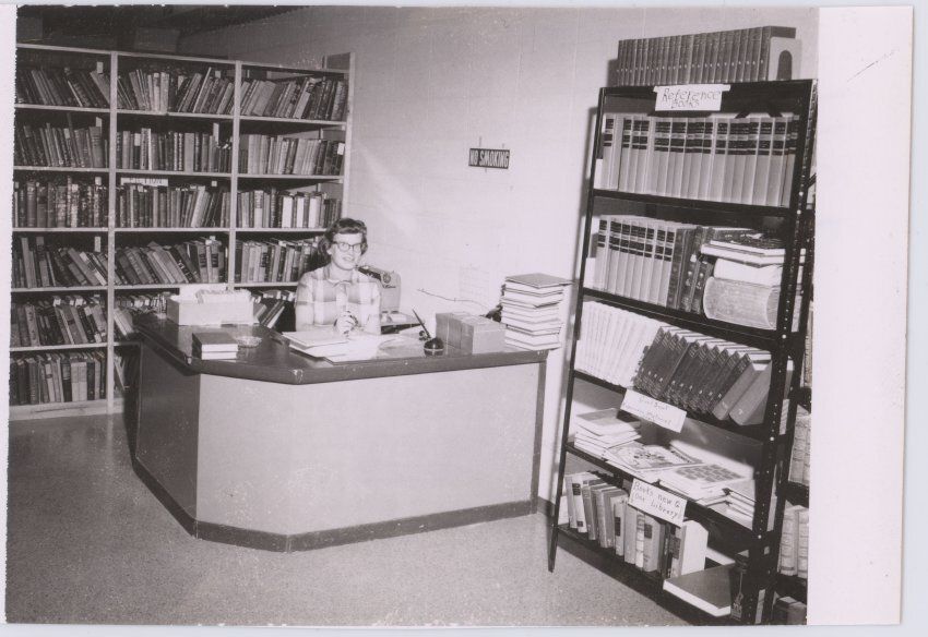Mariam Watkins, Assistant Librarian at the old Mamie Doud Eisenhower Library at 12 Garden Center, Broomfield. Woman sitting at a desk surrounded by shelves of books. B&W, 3.5x5in.Collection