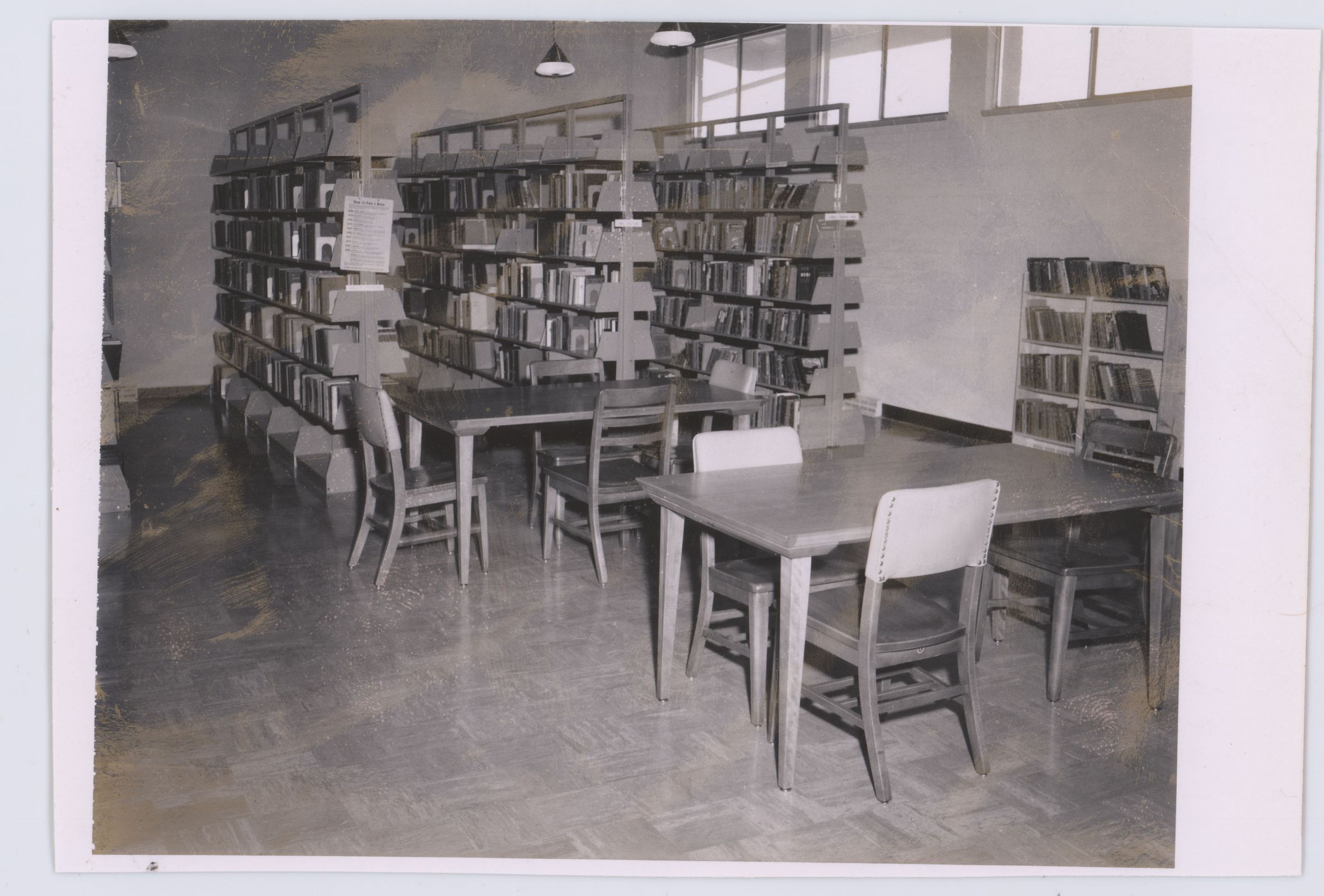 Interior of Mamie Doud Eisenhower library when it first opened in 1963 at 12 Garden Center. Shows room with rows of shelves of books and two wooden tables and chairs. Shows original linoleum flooring and modern light fixtures.