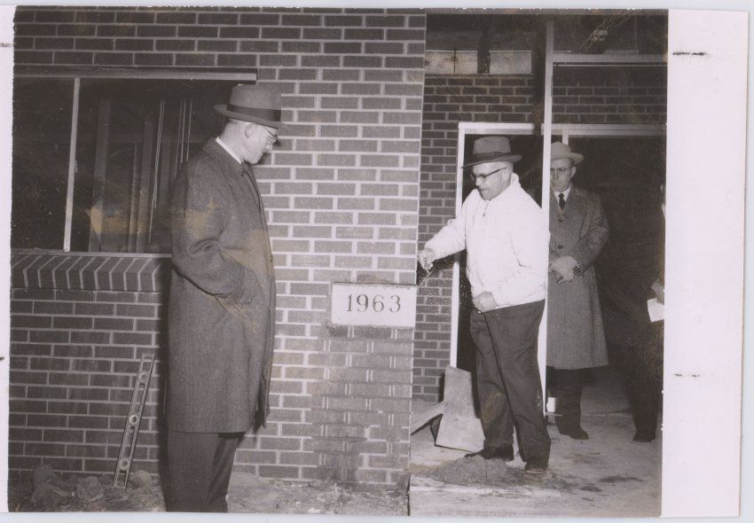 Laying the cornerstone of the Mamie Doud Eisenhower Library at 12 Garden Center, Broomfield. Wes Shonkwiler (right in light colored coat) and Reverand Bradley Skinner (dark coat with hands in pocket). Wes Shonkwiler has raised the cornerstone into place. B&W, 3.5in.