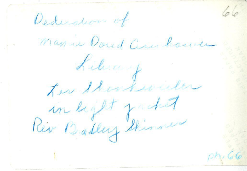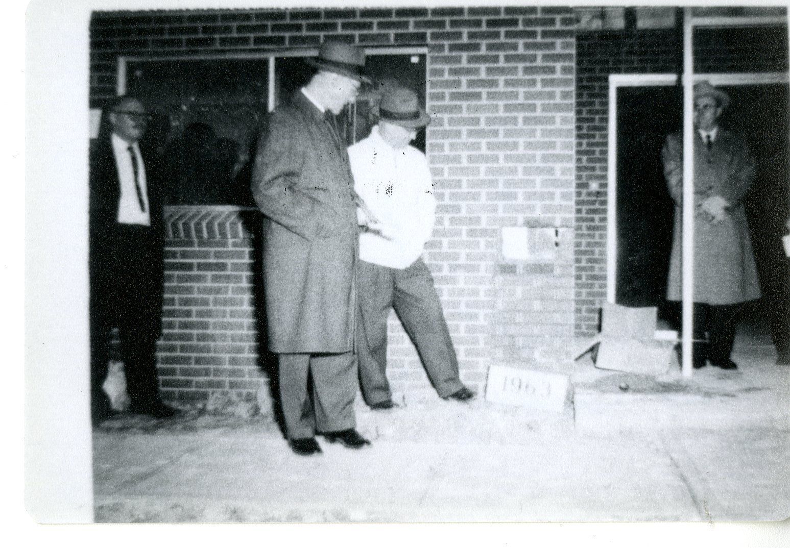 Laying the cornerstone of the Mamie Doud Eisenhower Library at 12 Garden Center, Broomfield. Wes Shonkwiler (right in light colored coat) and Reverand Bradley Skinner (dark coat with hands in pocket). Cornerstone lays on ground. B&W, 3.5in.