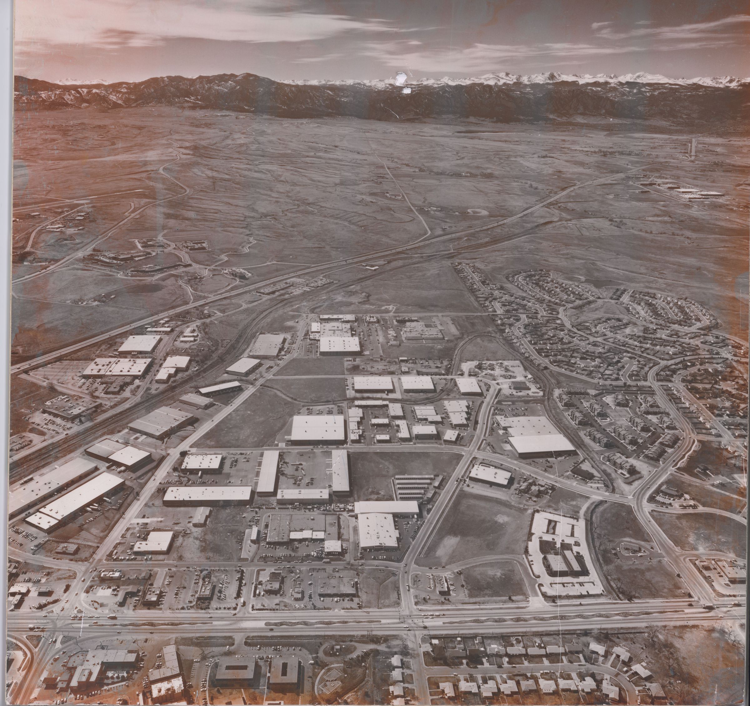 Oversize aerial photo mounted on foamcore. Shows west Broomfield looking west, Route 287 is in foreground. Exact date is unknown, but the Depot appears in its present location next to Zang Spur Park (the Depot was moved in 1976). Also the the neighboorhood around Lac Amora Park looks complete (built around 1980). Many of the buildings seen W. Midway and Industrial Lane are still standing in 2020.