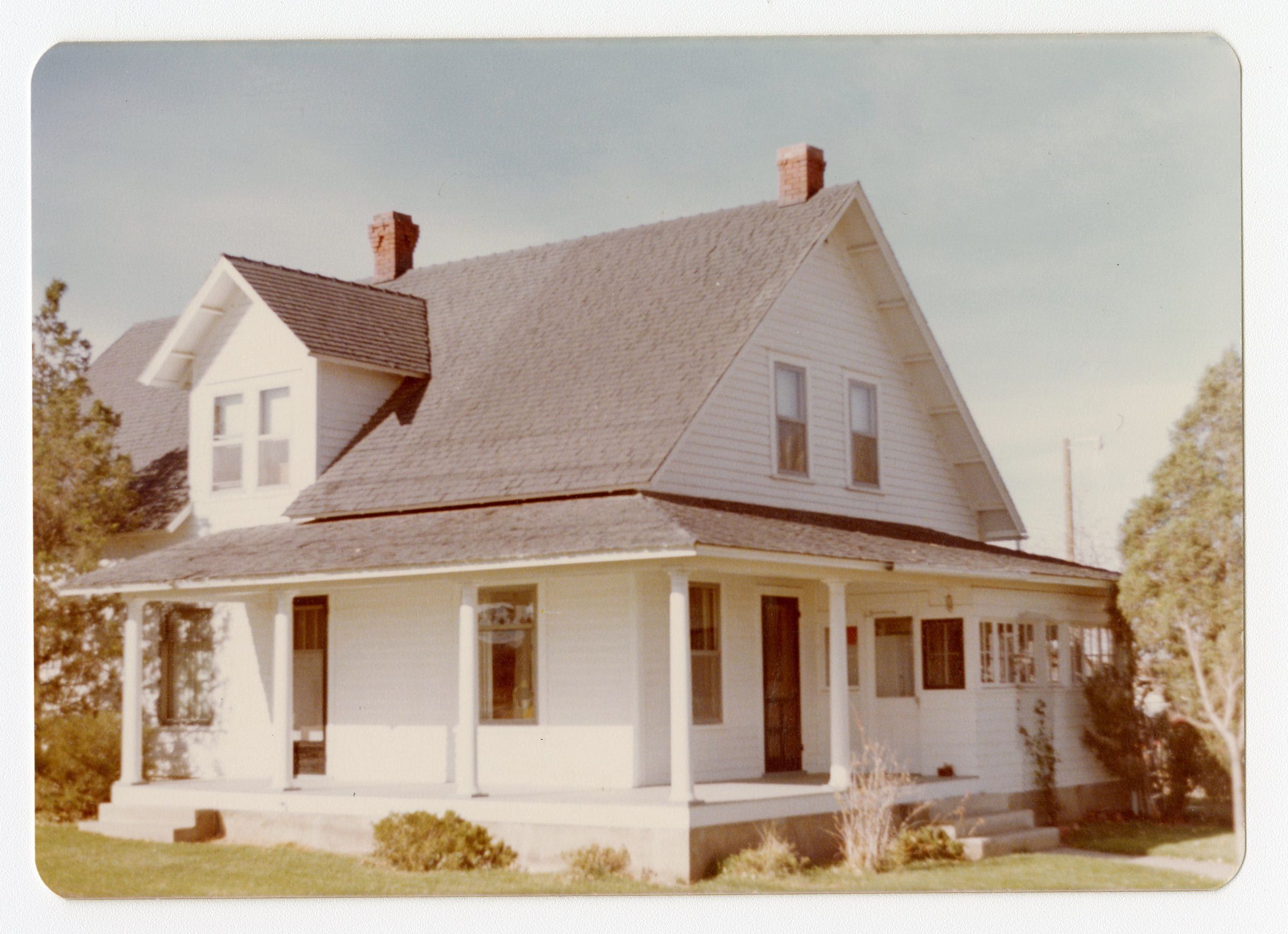Color photograph of the Brunner Farmhouse. It shows the front and side of the house. There is a wrap-around porch on the lower level of the house.
