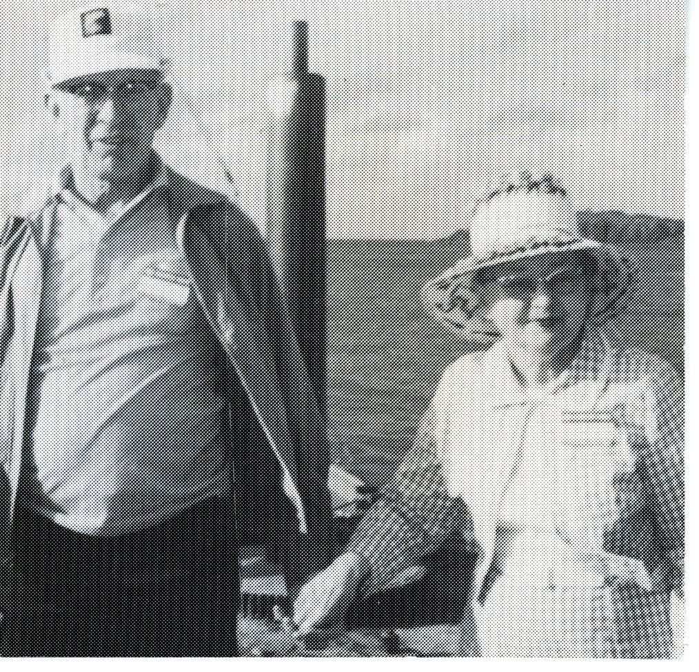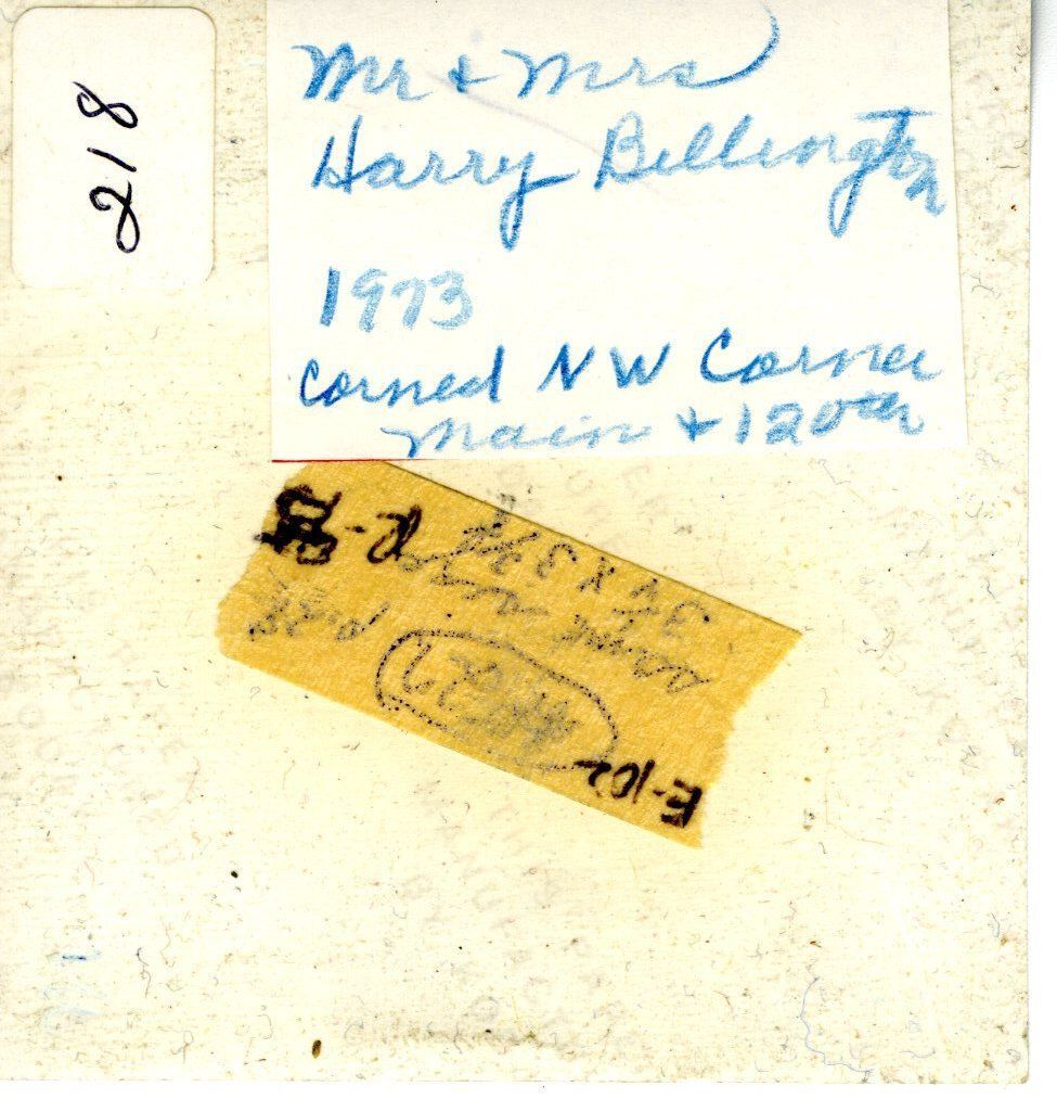 Photo of Mr. and Mrs. Harry Billington, 1973, at the NW corner of Maine Street and 120th. Sqaure B&W photo, with visible pixelation.