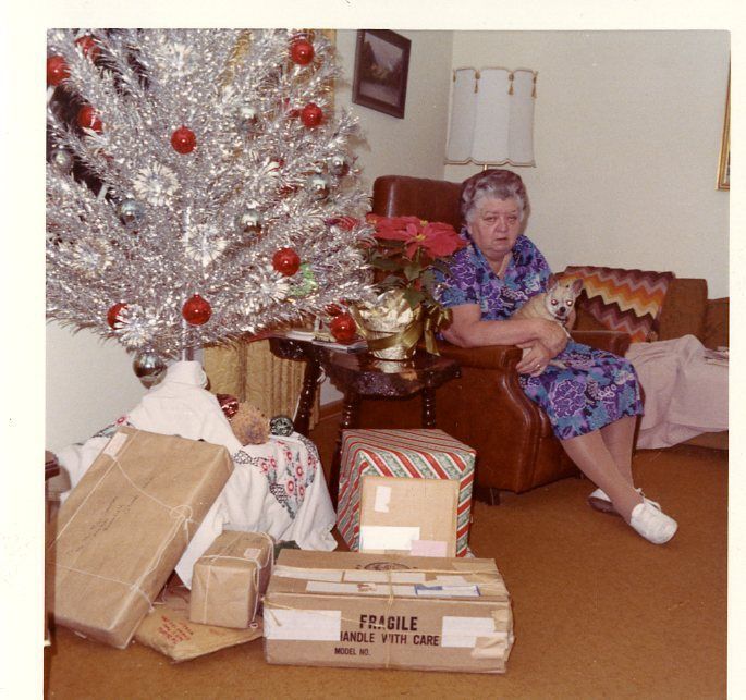 Emily Crawford at Christmas 1972. She is on the right side of the image, holding a dog. Tree and presents on left side of image.