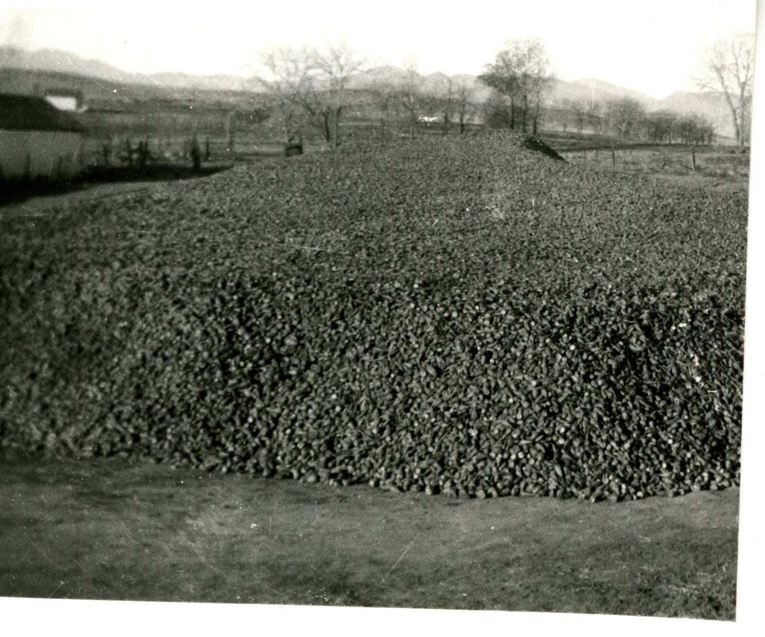 Broomfield Beet Dump, located on Railroad north of Broomfield Lumber company. 1500lbs of beets, most grown on the land that became Broomfield Heights. Undated photo.