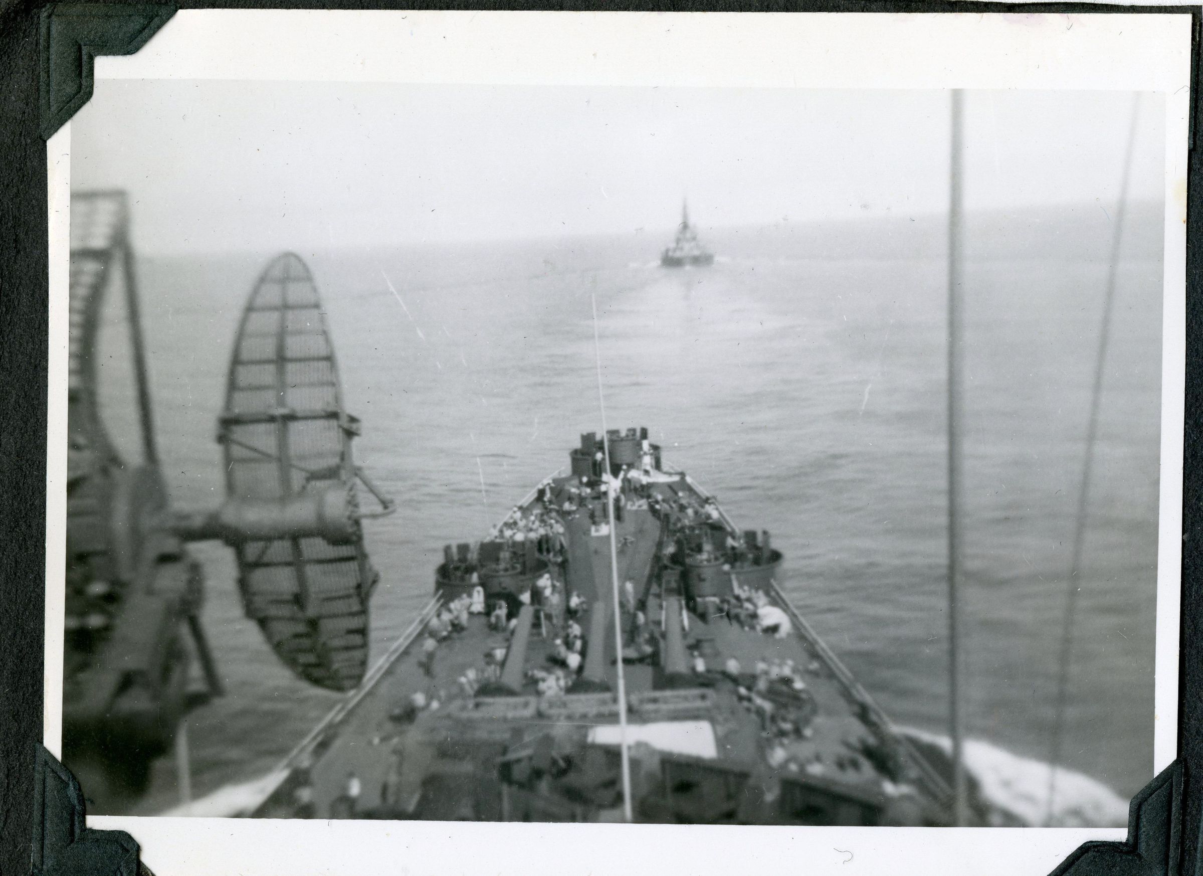 Black and white photograph of the front of a ship. This is possibly the boat that Clyde Brunner served on during his time in the Navy. Photograph is of the forecastle of the U.S.S. South Dakota with the Alabama dead ahead.