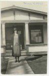 Black and white photograph of a woman standing on the walkway in front of a single-story house. The woman is wearing a long dress, long sweater, a hat, stockings, and black shoes. Photograph is dated Mar 4, 1925.Lexicon