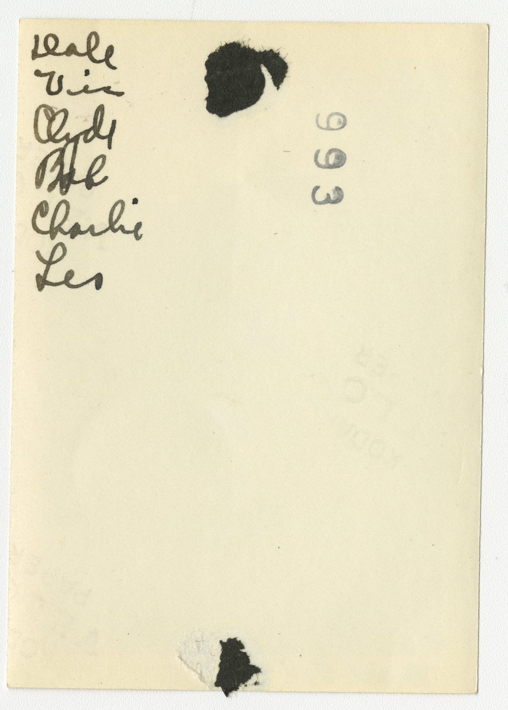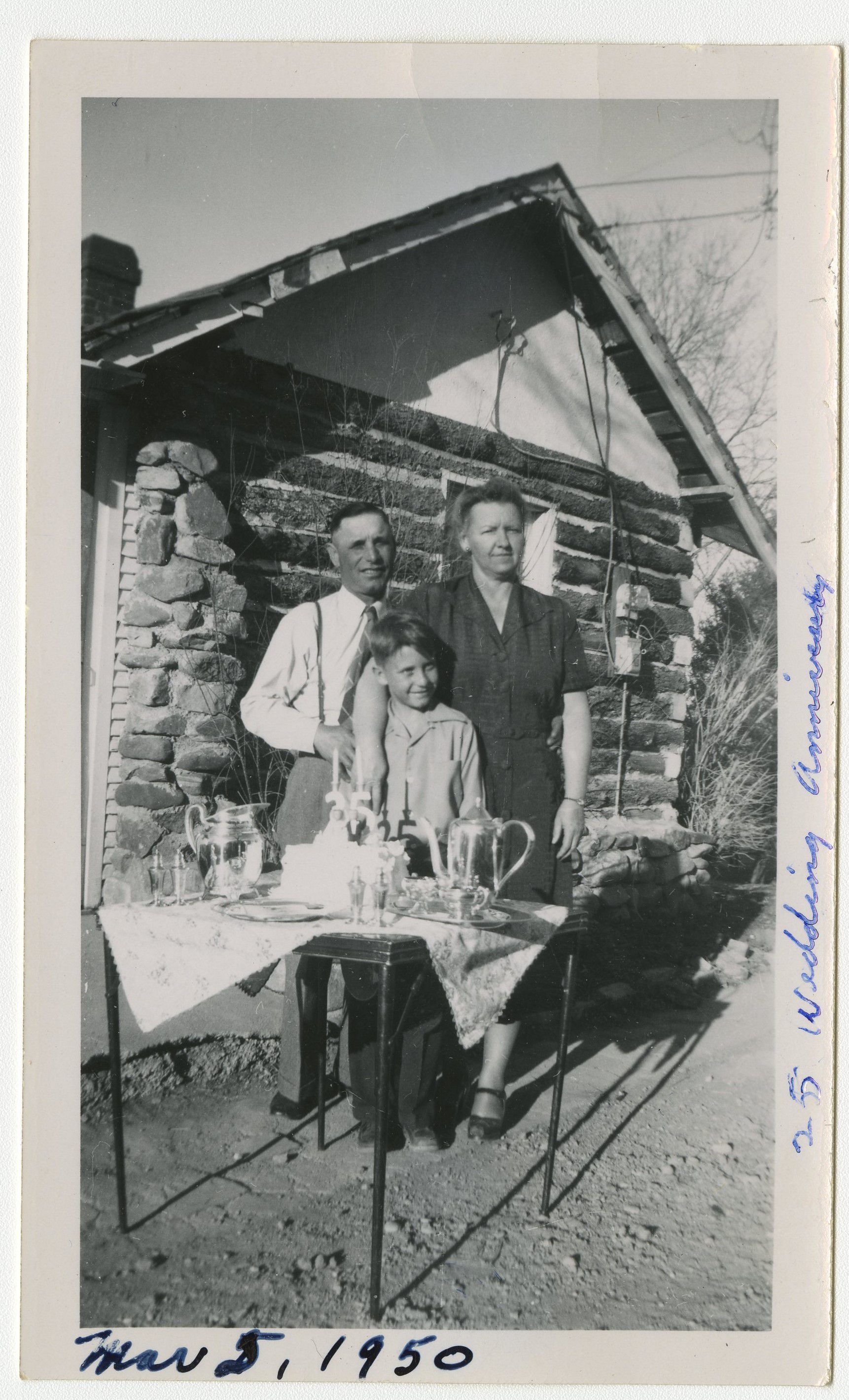 Black and white photograph of Lester C. Brunner, Lib Brunner, and another person. Handwritten on the lower edge is Mar 5, 1950 and handwritten on the right edge is 25 wedding anniversary.