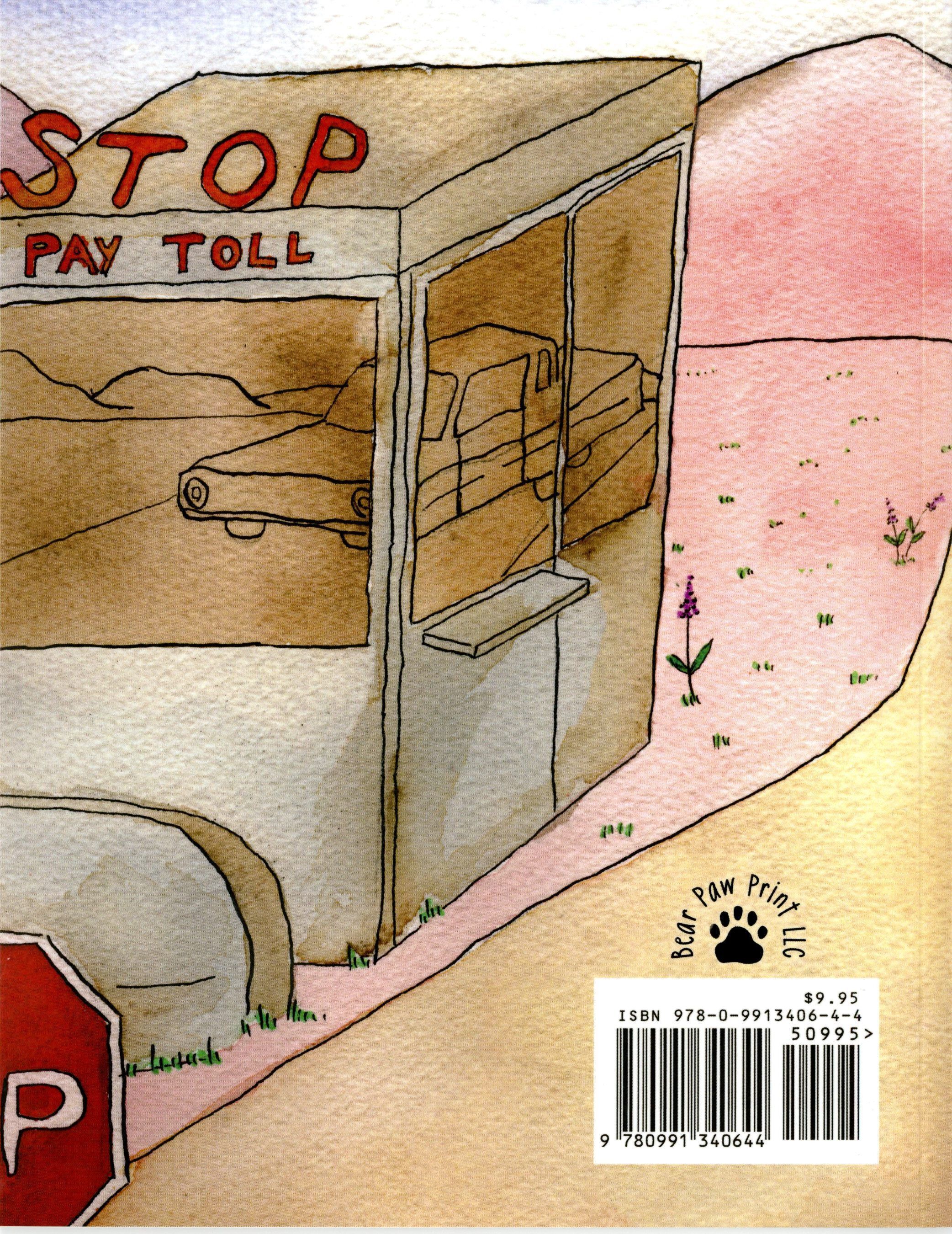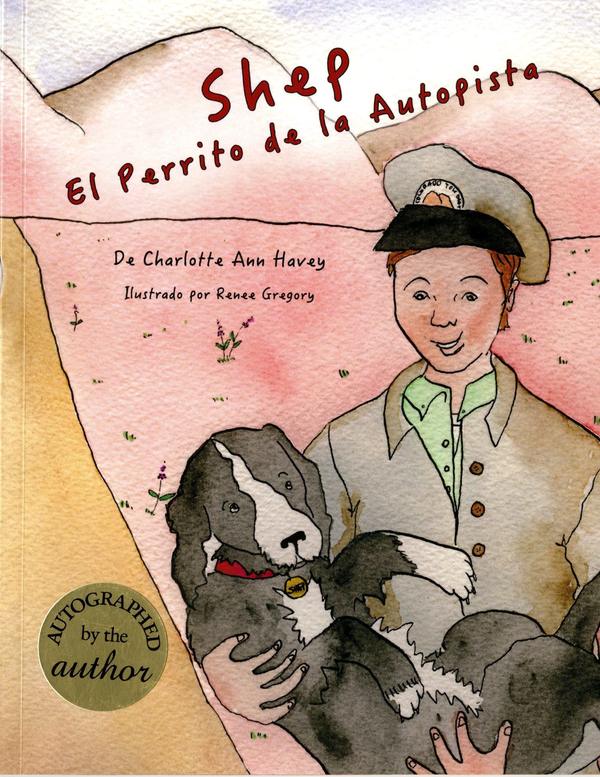 A paperback, the front cover is printed in color and has a watercolor style image of a tollbooth operator carrying Shep in the foreground with pink mountains in background. The title can be found in red at the top left corner. An "autographed by the author" sticker is on the bottom left corner. This is a thin book, 7" wide and 9" tall.Collection