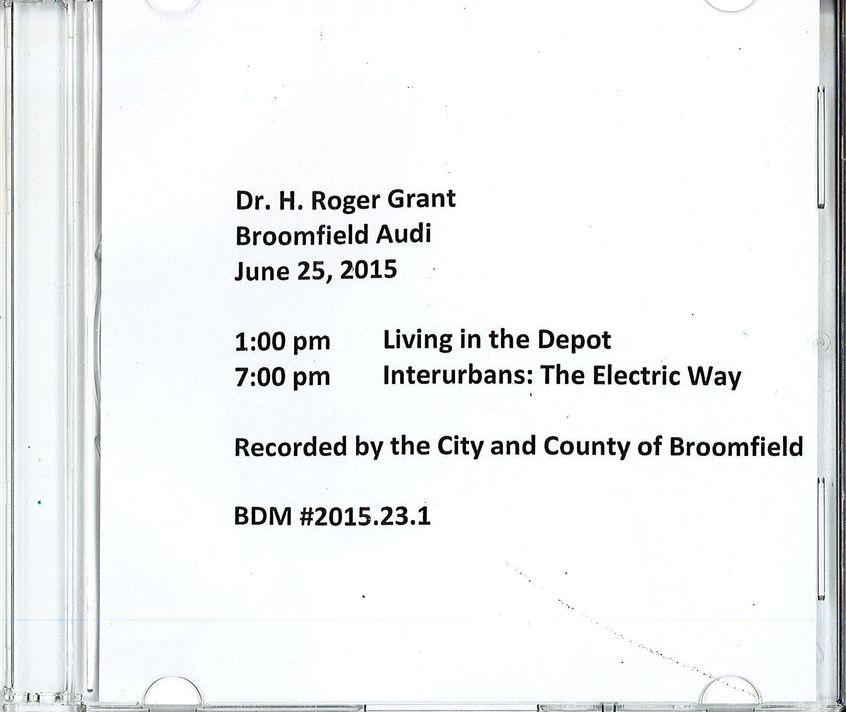DVD with recordings of two talks by Dr. Roger H. Grant filmed in the Broomfield Auditorium on June 25, 2015. The museum brought Dr. Grant, professor at Clemson University and President of the Lexington Club, to Broomfield to share his expertise on living-in depots and interurbans.