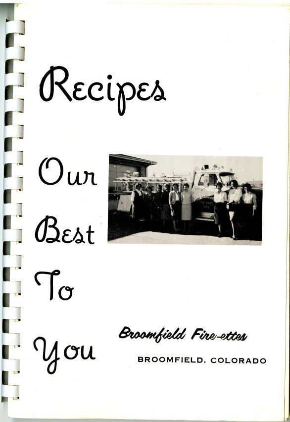 This is a 72-page 9"(L) x 6" (W) book with white plastic comb binding. There is black and white photo of nine women standing in front of a fire truck on the front cover with the title and "Broomfield Fire-ettes/ Broomfield, Colorado" in black text.Collection