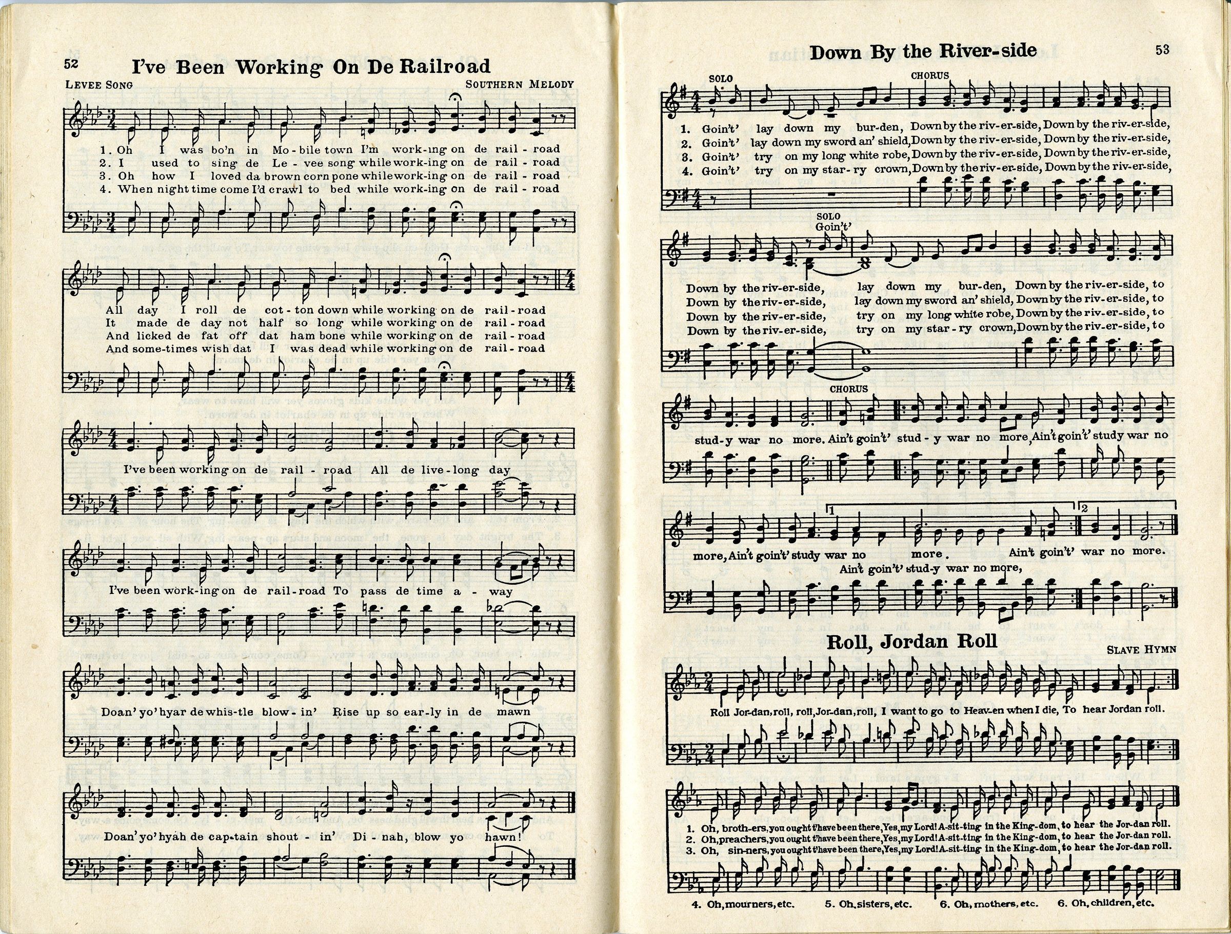 A songbook for group singing and the piano. The book contains music for several folk, national, holiday, and spiritual songs.