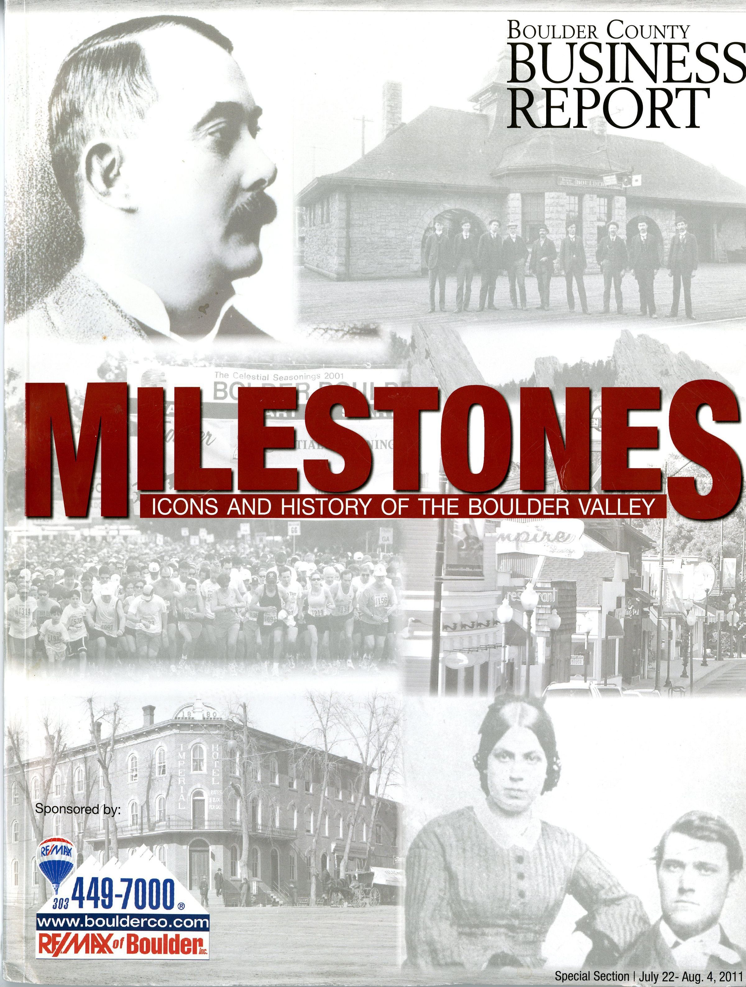 The periodical is 9" (w) x 12" (h) x .25" (d), paper bound. The cover has six images of black and white photographs segmented into two columns of three images. The upper left depicts a mustached man (Adolph Zang) in profile; the upper right has nine men lined up in front of a Boulder train depot; center left shows runners starting from a starting line at the 2001 Bolder Boulder; center right shows a line of stores in Boulder; the lower left has an image of Imperial Hotel; and the lower right shows a man and woman posing together. The reverse side of the periodical has a color advertisement for ReMax, with an image of hot air balloons.Collection