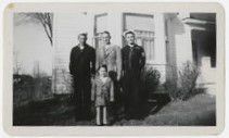 Black and white photograph of three men and a boy standing in front of a bay window of a house. The house is the Brunner farmhouse. Visible behind the people are three leafless bushes. There is a tree visible that sits on the opposite side of the house. The man in the middle is wearing a white shirt and a long dress coat while the other two men wear naval uniforms. The boy is wearing tan pants and a coat. The four people are Dale Brunner, Gib Brunner, Clyde Brunner, and Lester K Brunner.