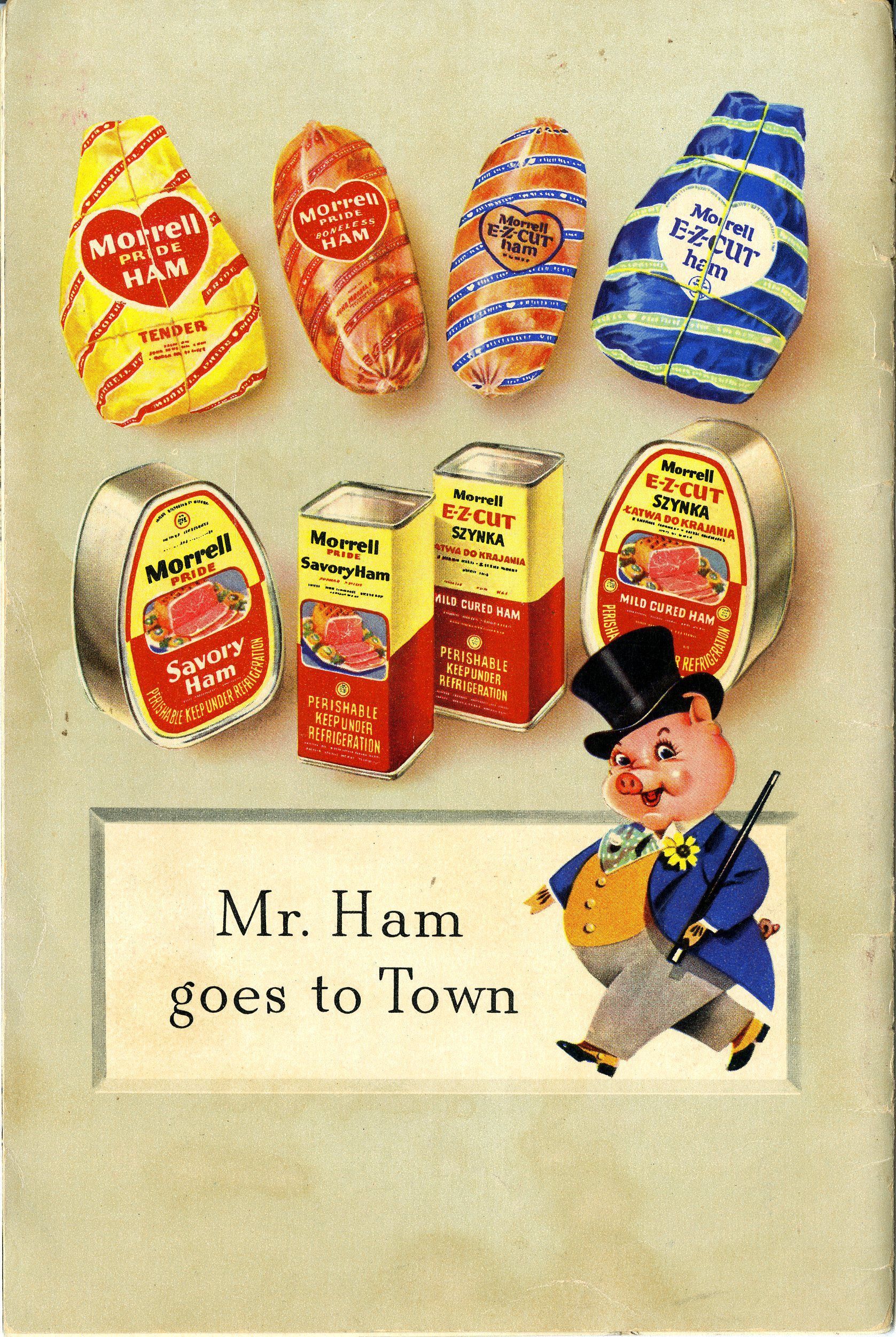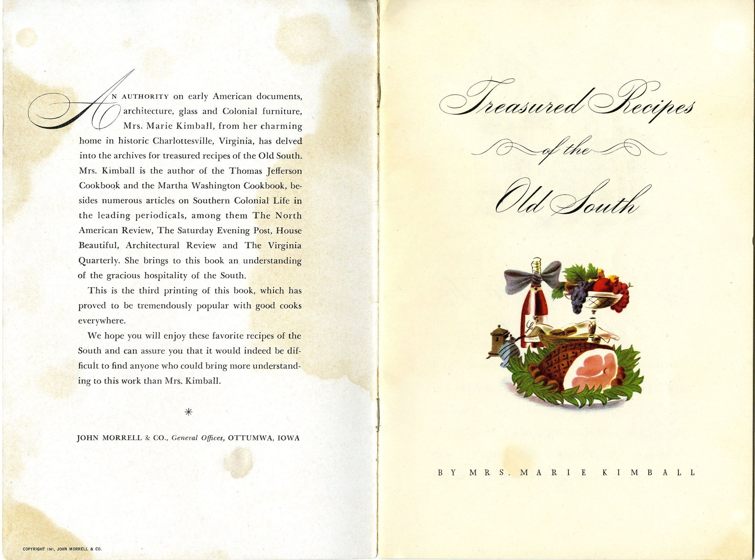 A cookbook for recipes from the American South, 1941. The book contains several types of recipes, mostly pertaining to ham dishes. The book was published by John Morrell and Company, which produced hams and canned ham products. Much of the book includes advertisements and recomendations for John Morrell hams.