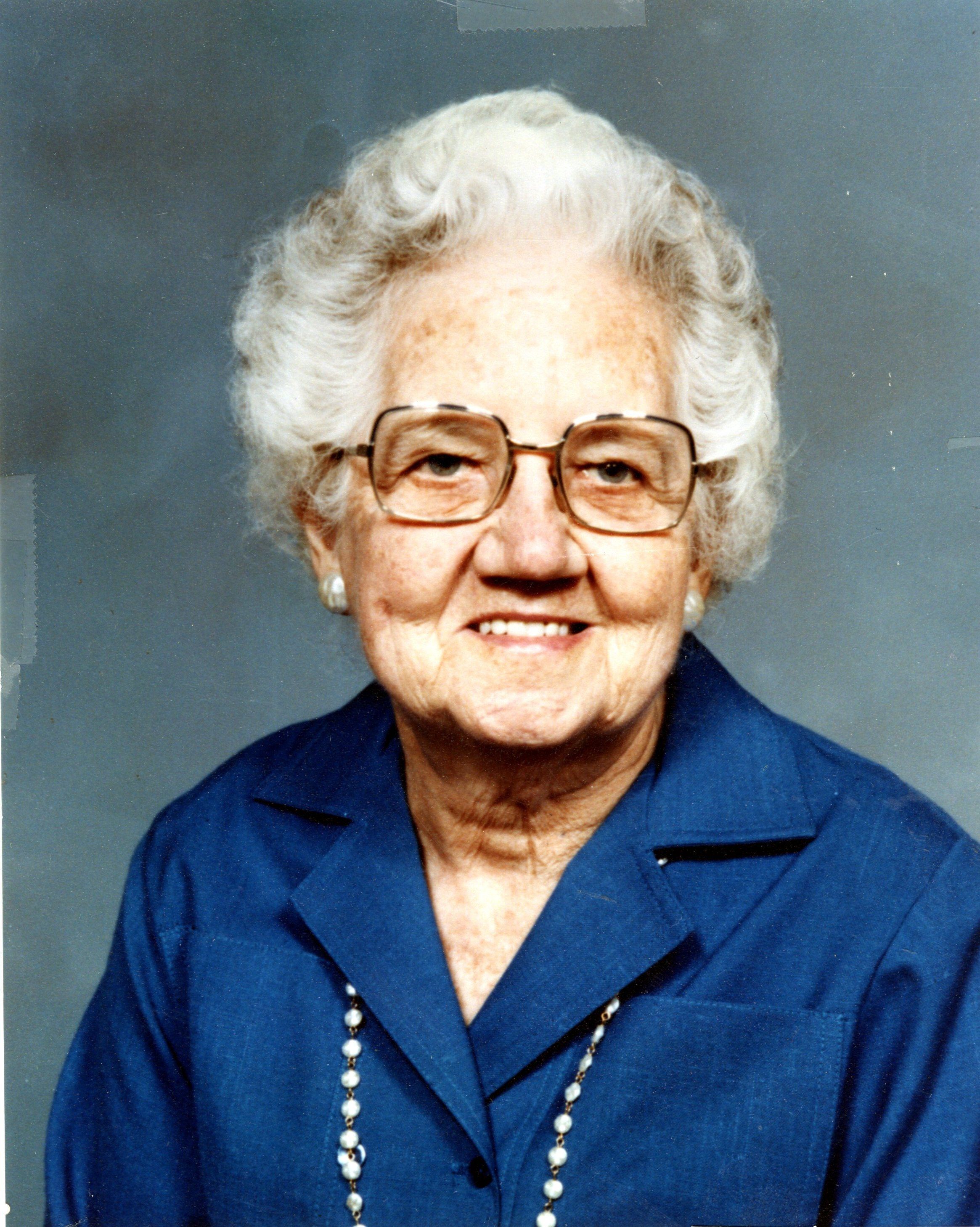 Photo of Gladys Haskins AARP Chapter 1709 Broomfeld Chapter President - 1974-1975 Colored image of an older woman with white hair wearing a blue blouse and pearl necklace, blue studio background.