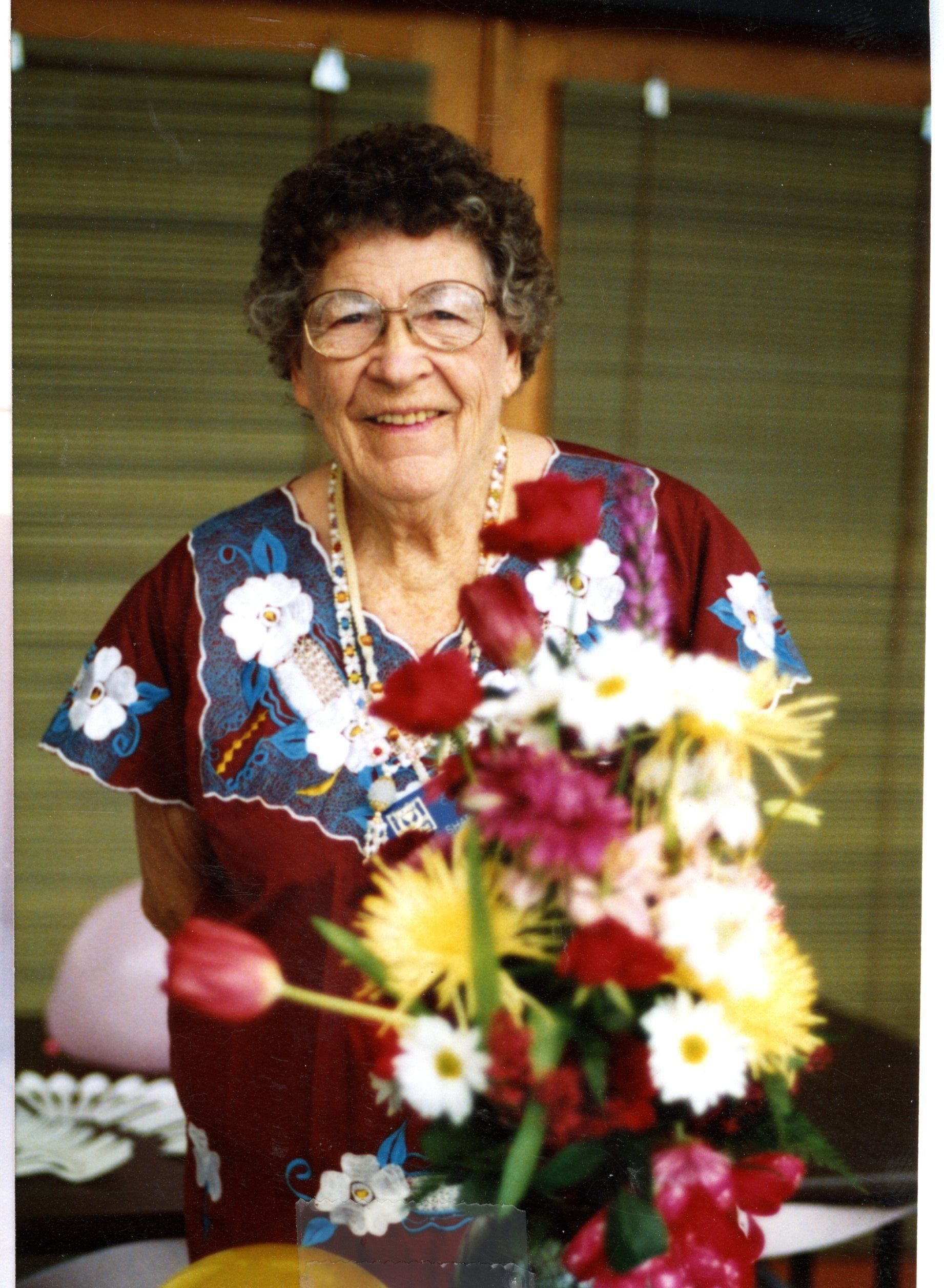 Photo of Elsie Sharp AARP Chapter 1709 Broomfeld Chapter President - 1978 Colored photo of a dark haired older woman wearing a red and floral kaftan. A floral bouquet in front of her.