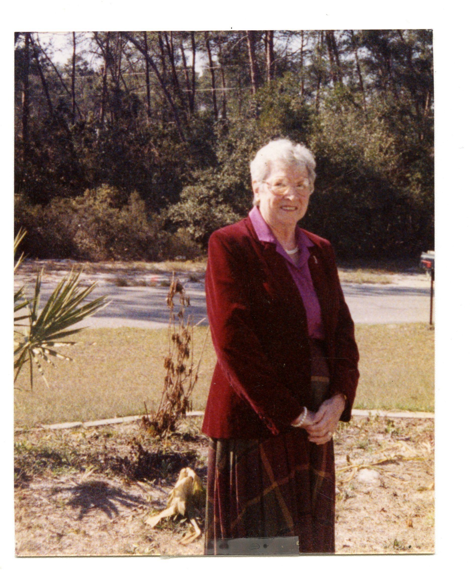 colored photo of Verne Ruth. AARP president from 1978-1979. Older lady with white hair and a red dress standing outside