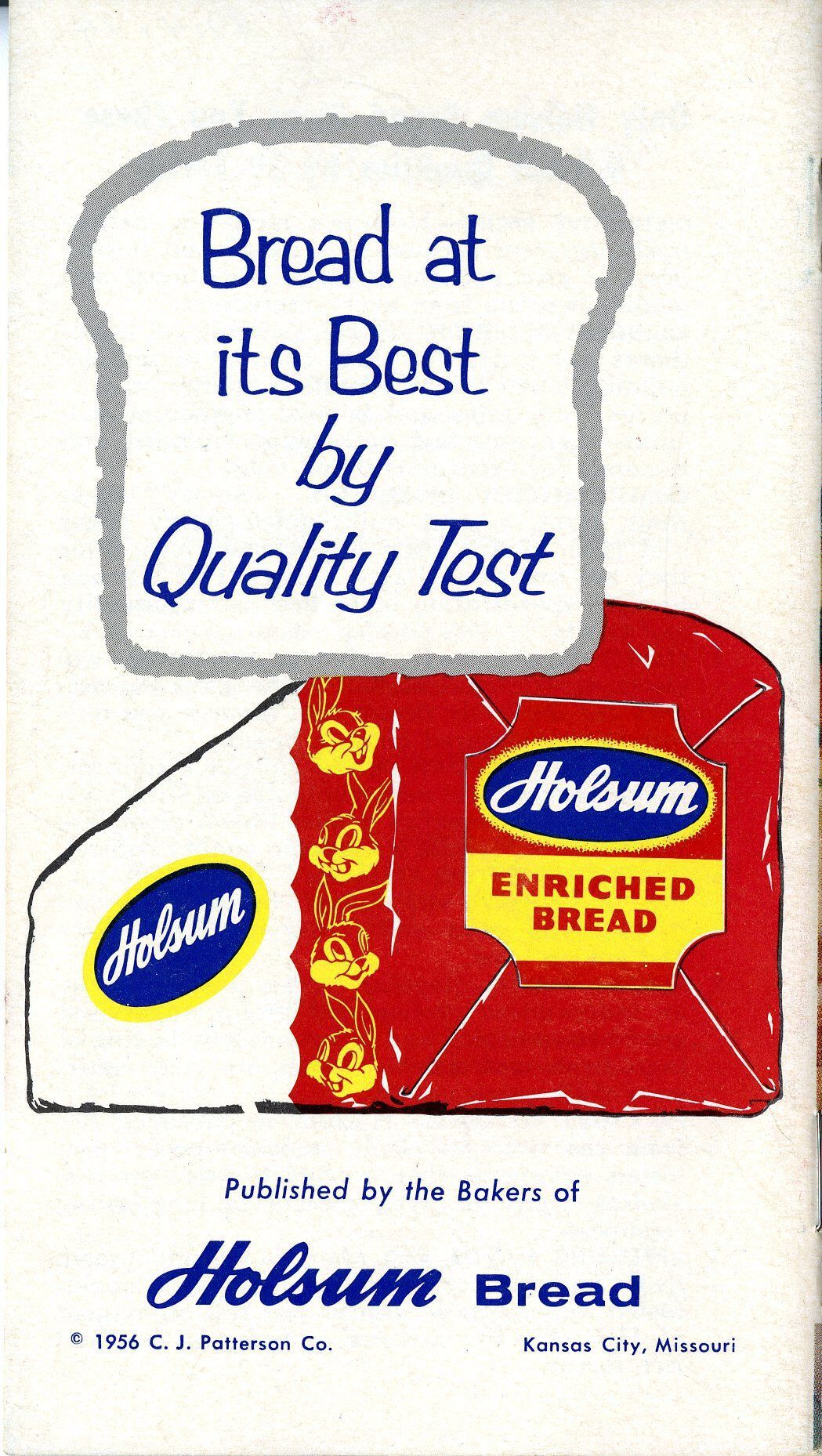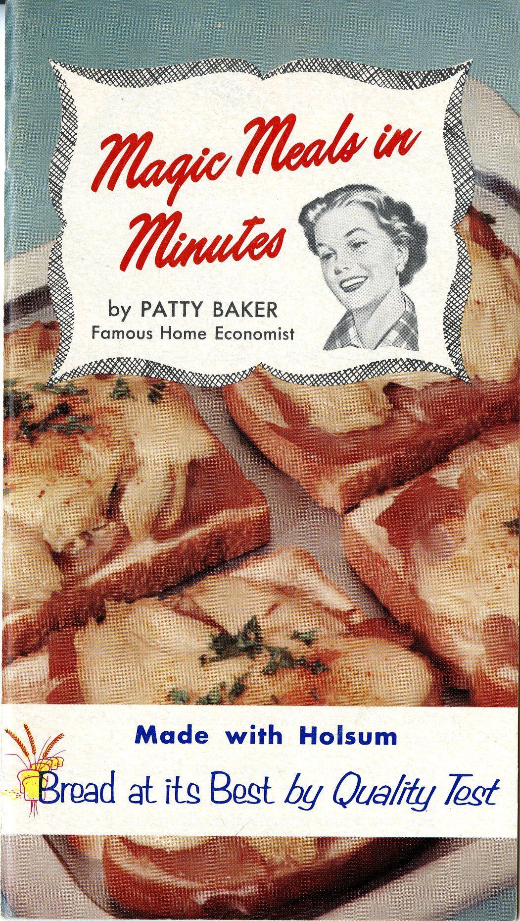 The book is 3.5" x 6.25", staple bound, paper. The cover has a color photographic picture of open faced sandwiches, as well as a black and white illustration of a woman's face, supposedly Patty Baker. A banner at the bottom of the cover has text stating, "Made with Holsum, Bread at its Best by Quality Test." The reverse cover has a color advertisement for Holsum Bread. The inside is filled with food illustrations with corresponding recipes.Collection