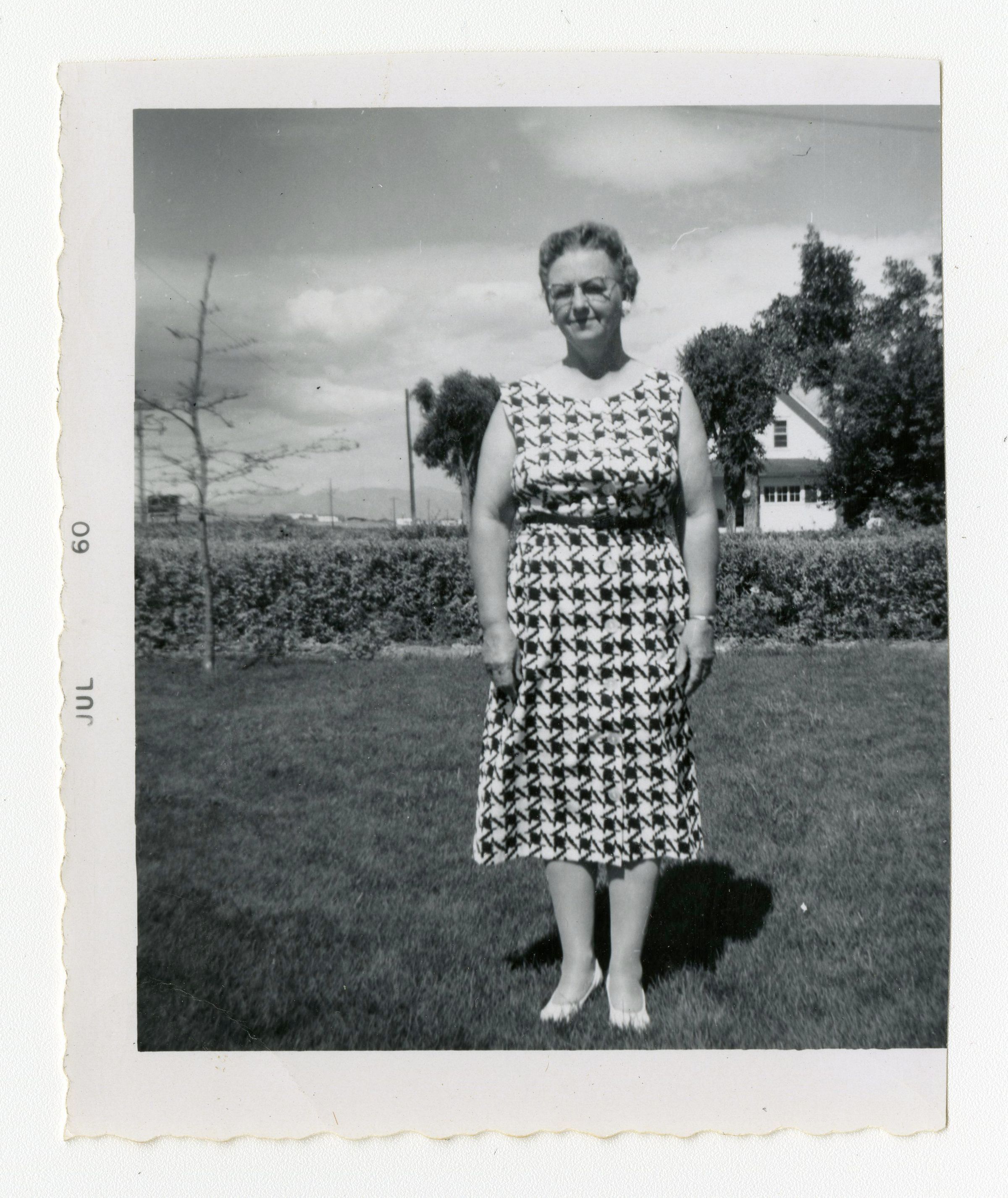 Black and white photograph of Lib Brunner. She is wearing a black and white dress and is standing outside. Photograph is probably taken at the Brunner Farm.