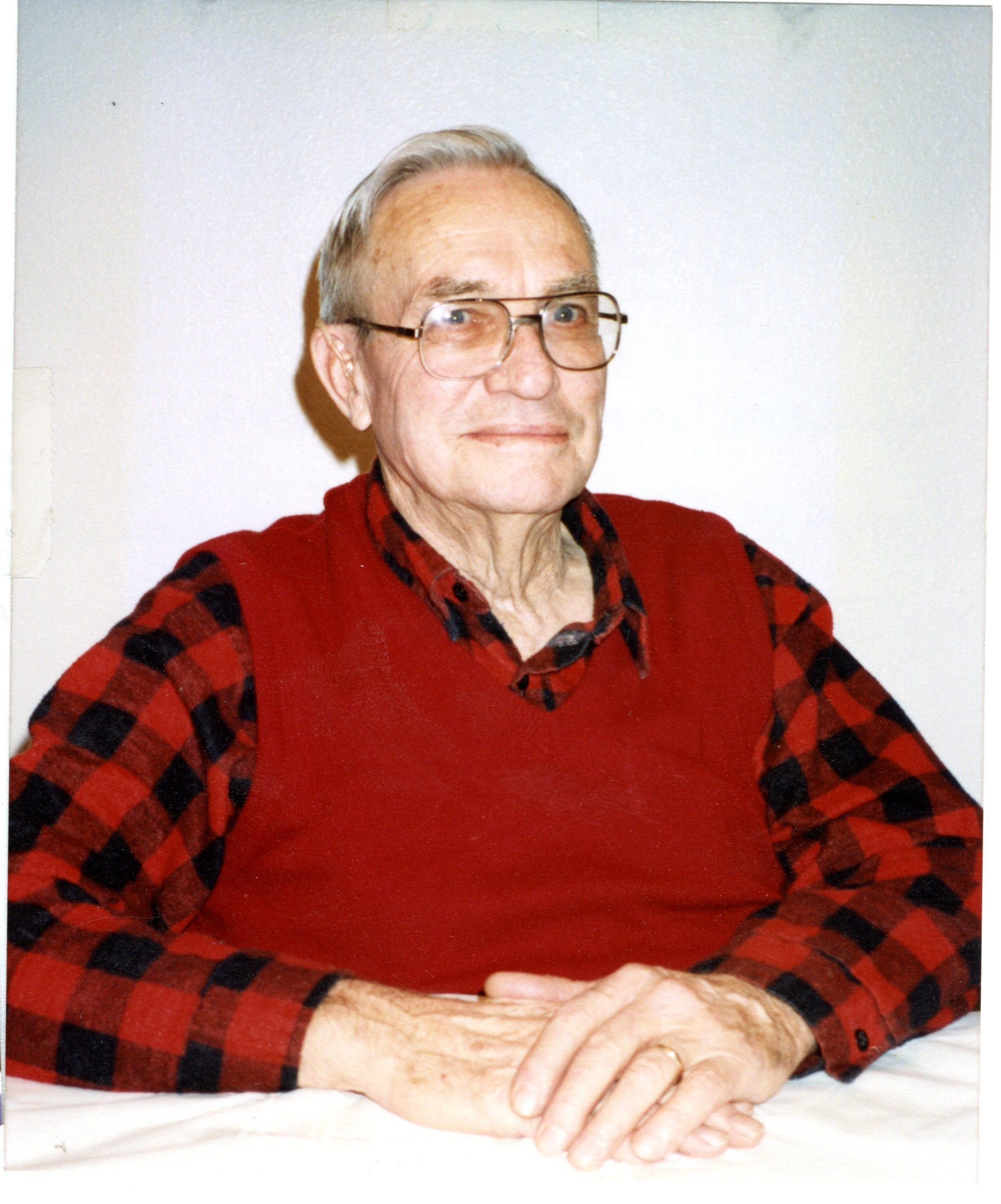clor photo of a man with gray hair and a red vest and glasses paul furst president of aarp 1986-87