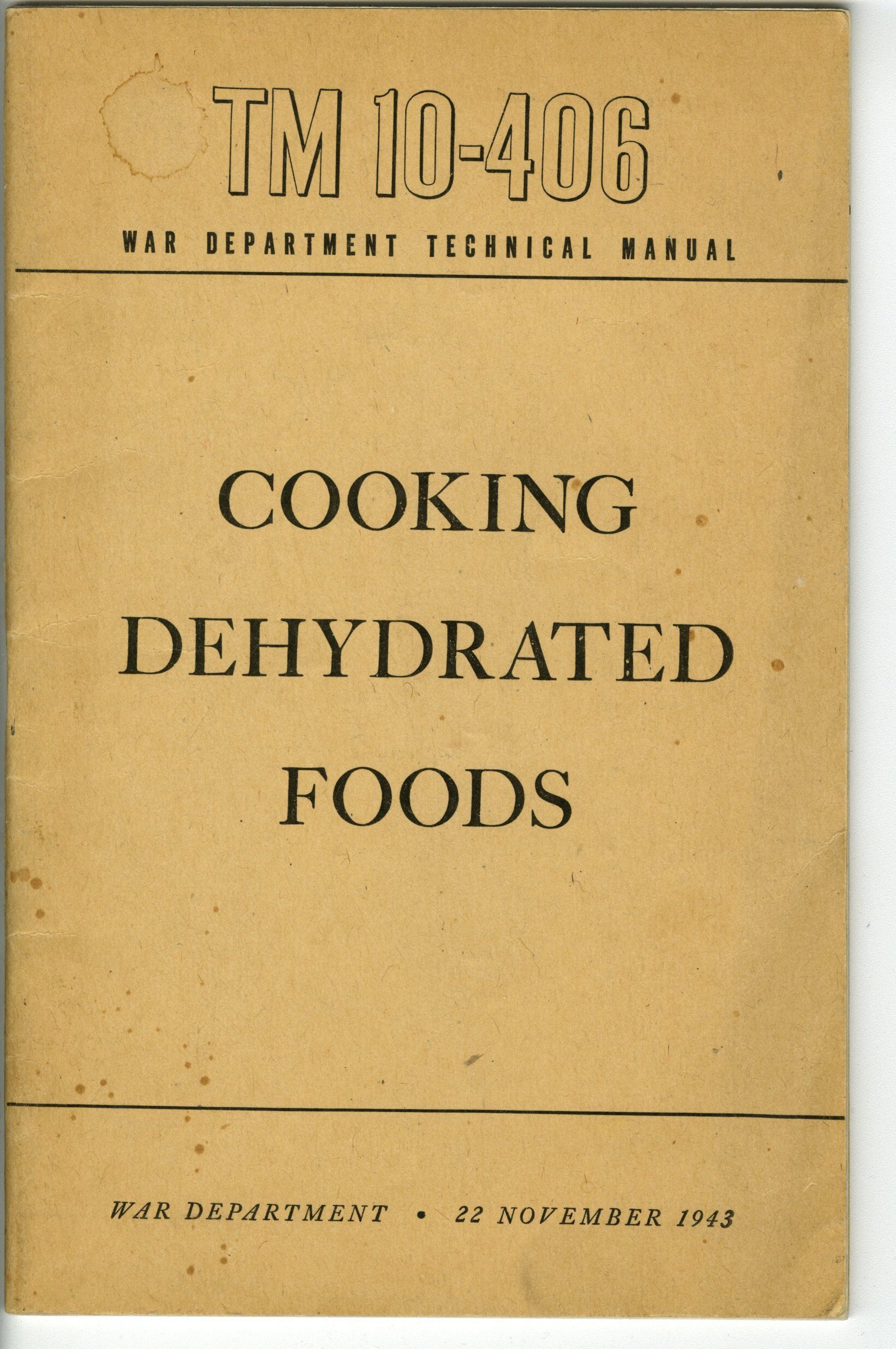 Cookbook with a table of contents, five chapters, three appendices, and an index. Chapters are titled "General," "Reconstitution of Dehydrated Foods," "Vegetables," "Eggs and Meat Dishes," and "Desserts." The cookbook was written for U.S. Army mess officers and cooks.