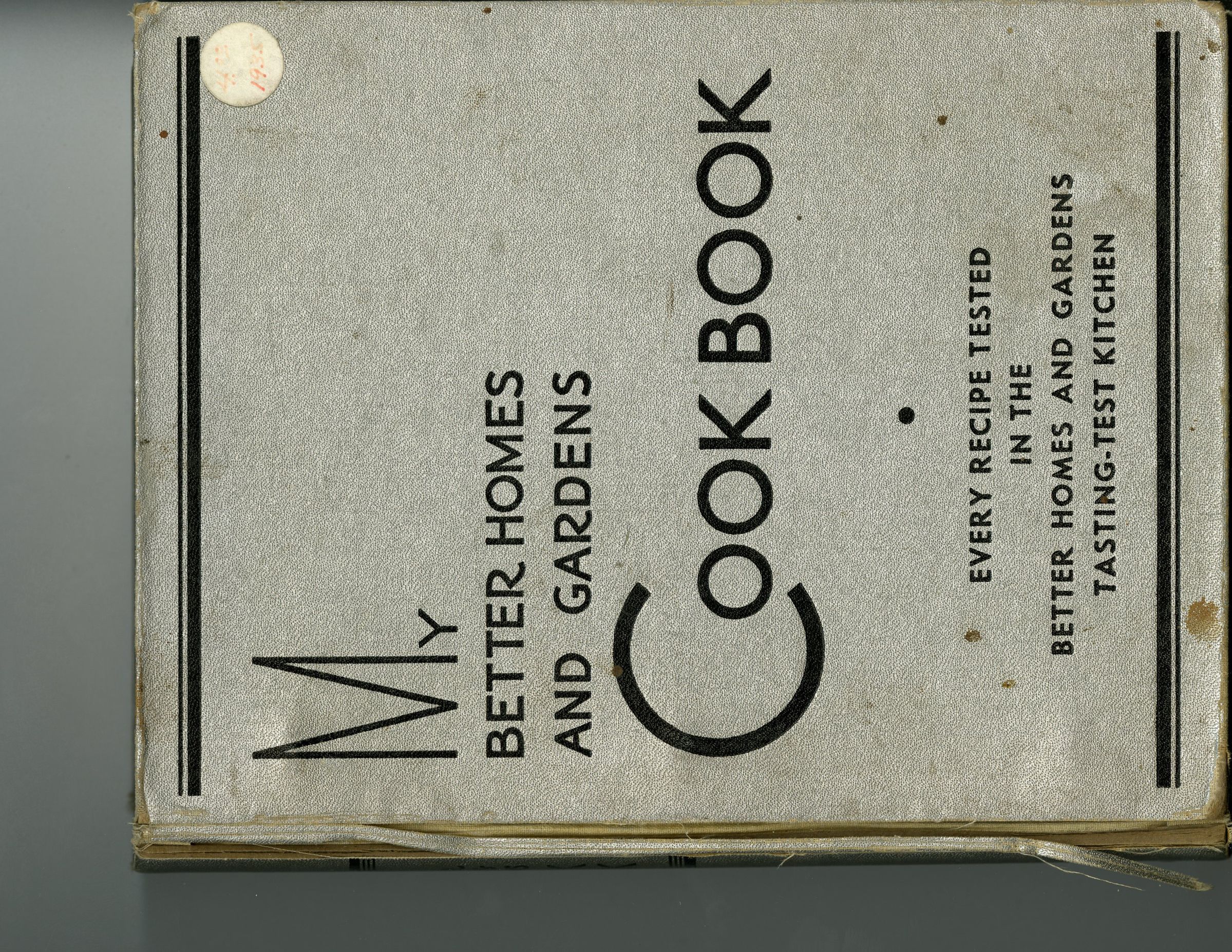 Cookbook with sixteen tabbed chapters: Nutrition Menu Planning, Beverages, Breads, Cakes & Cookies, Candies, Canning - Preserving, Fish, Game & Chicken, Meats-Eggs-Cheese Casserole Dishes, Pickles, Pies, Salads & Sandwich, Soups, Vegetables, The Hostess, and Appetizers. Various clippings scattered throughout. Inside of the front and back cover contains charts and measurements for food prepreparation.