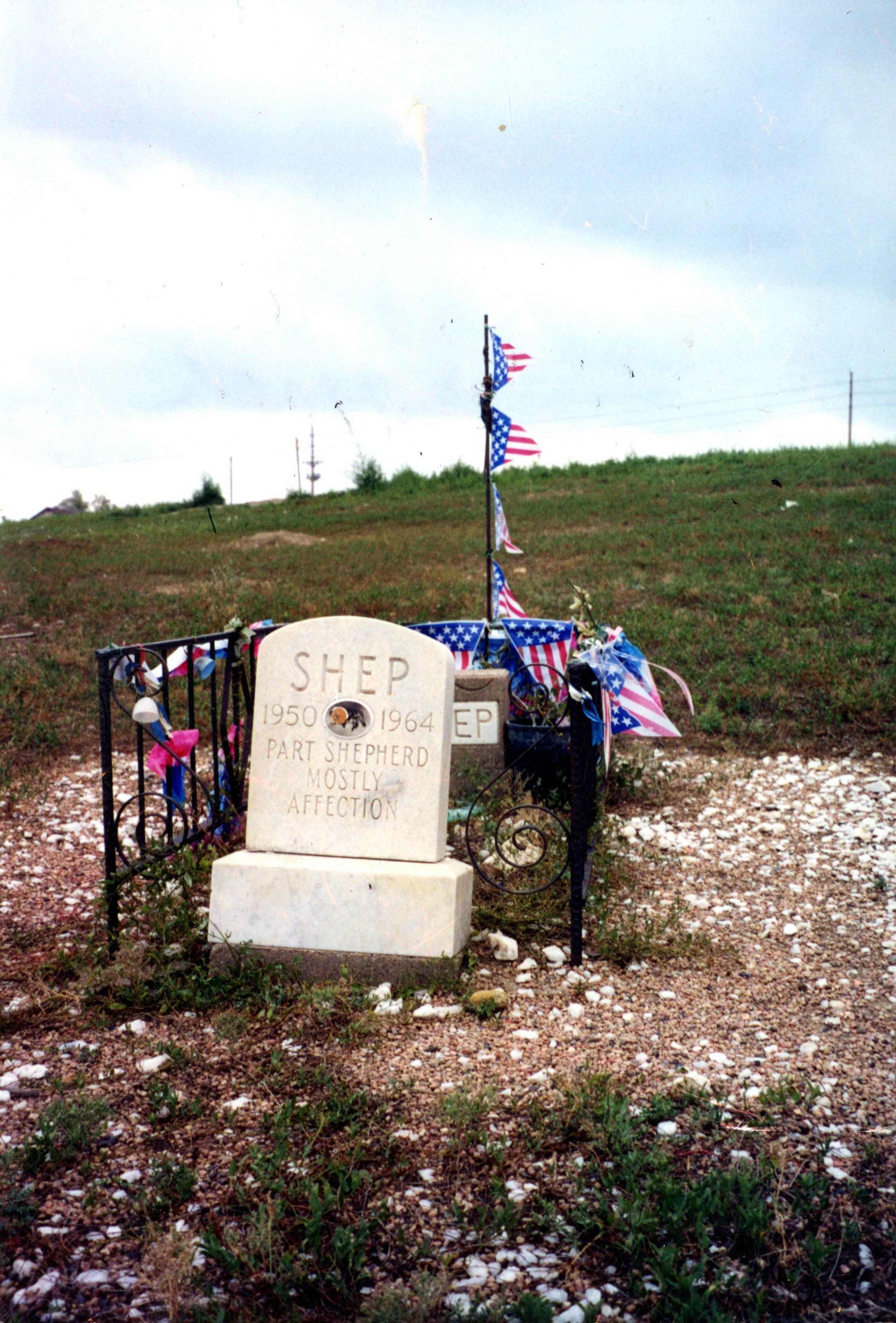 Color photo, 4x6in, of Shep's grave at its original location by Highway 36 decorated with American flags after the September 11, 2001 Terrorist attack in NYC. 9/11