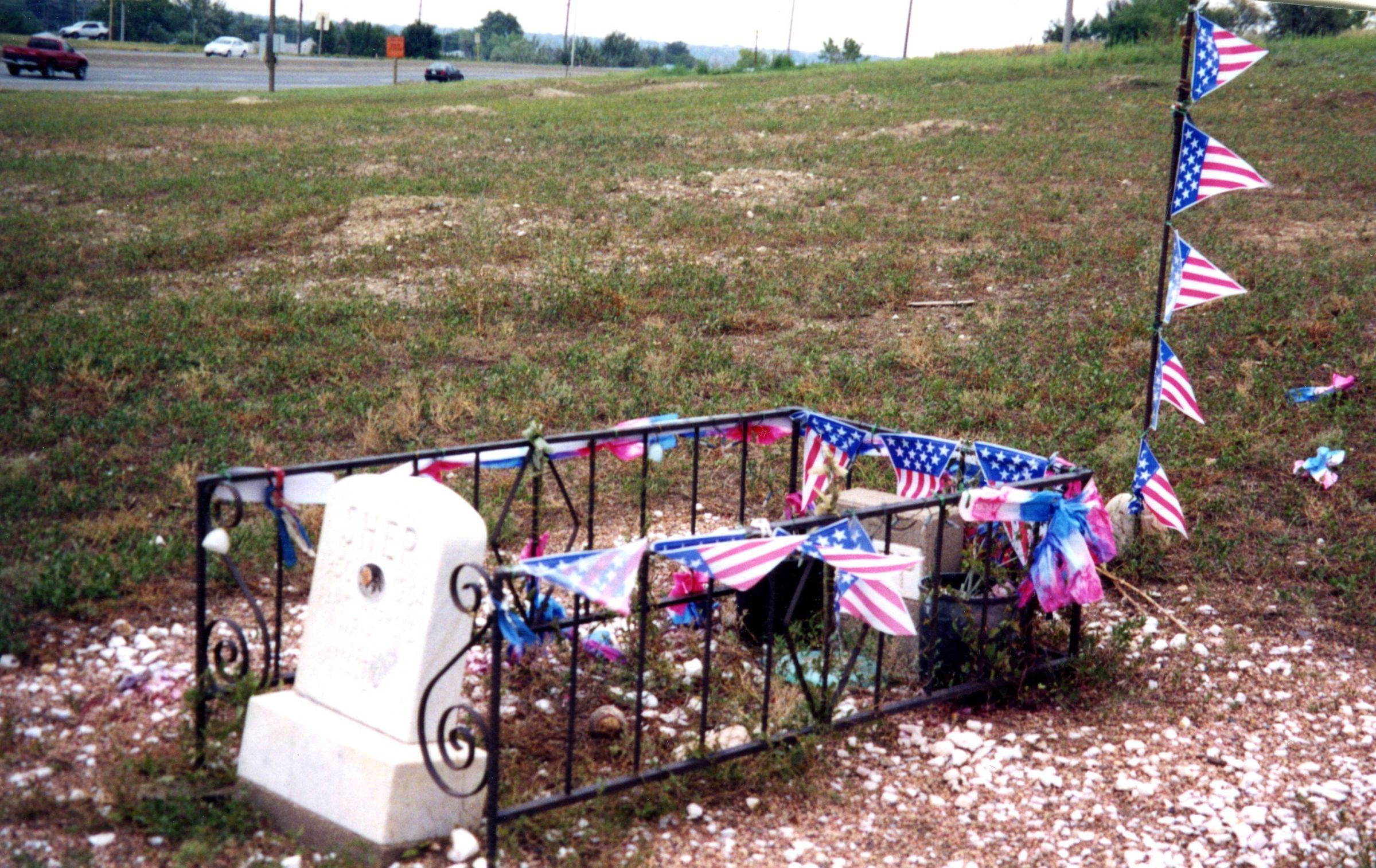 Color photo, 3.5x5.5in, of Shep's grave at its original location by Highway 36 decorated with American flags after the September 11, 2001 Terrorist attack in NYC. 9/11
