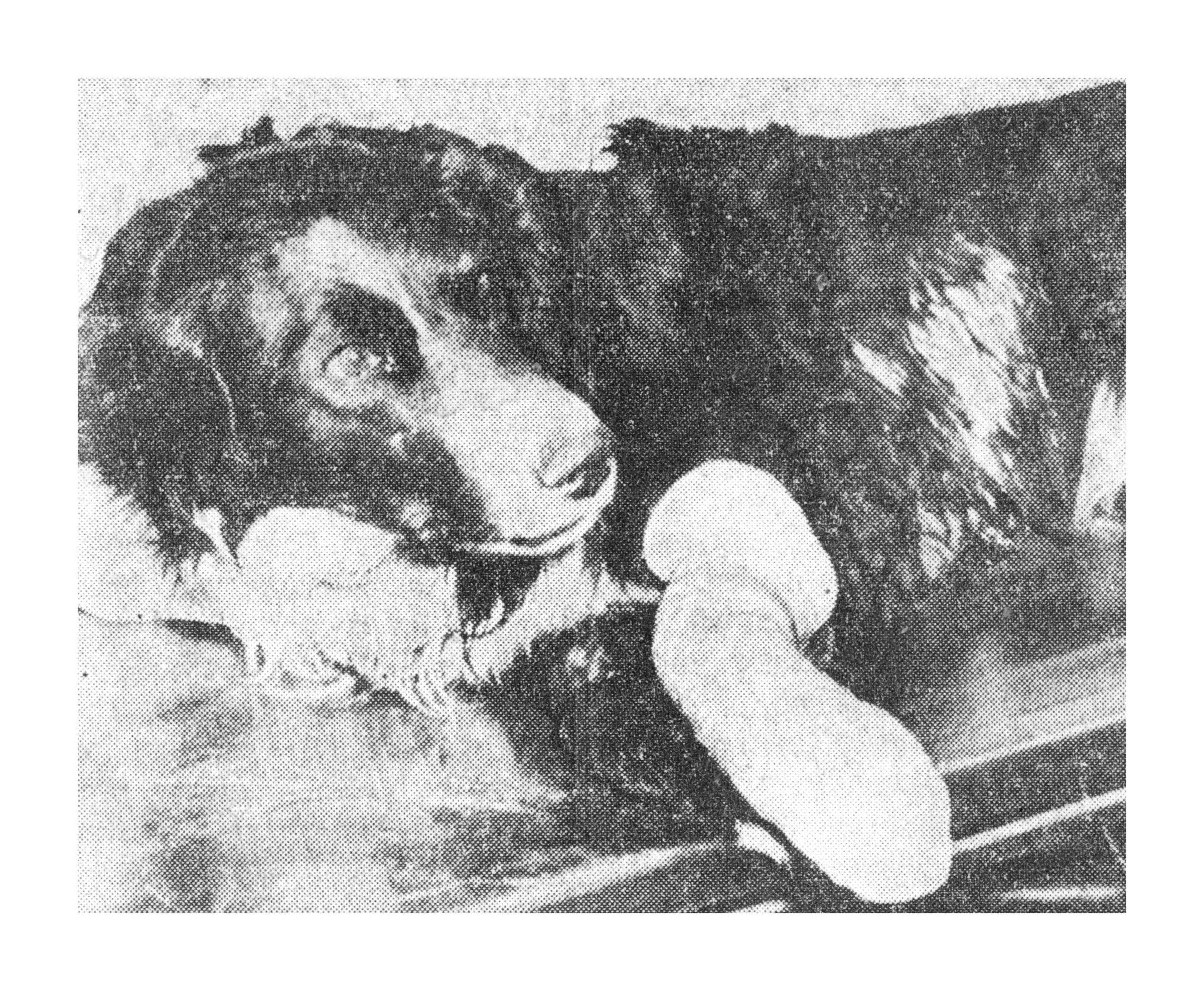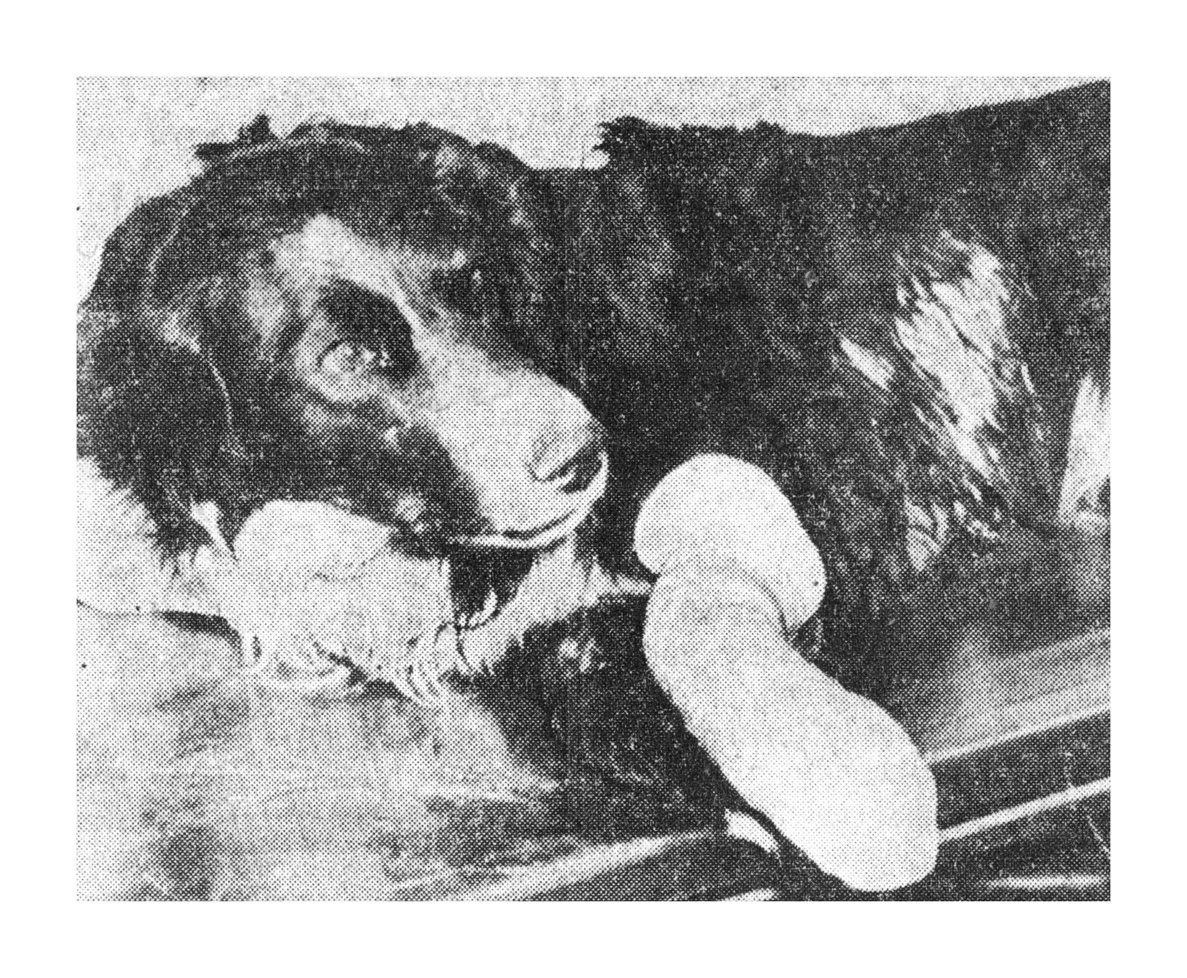Shep the Tollbooth Dog after he was shot in the leg. Black and white photo of a dog with his front paw in a cast. Shep was wounded in 1958 and was cared for by veteterinarian Dr. Clyde Brunner.