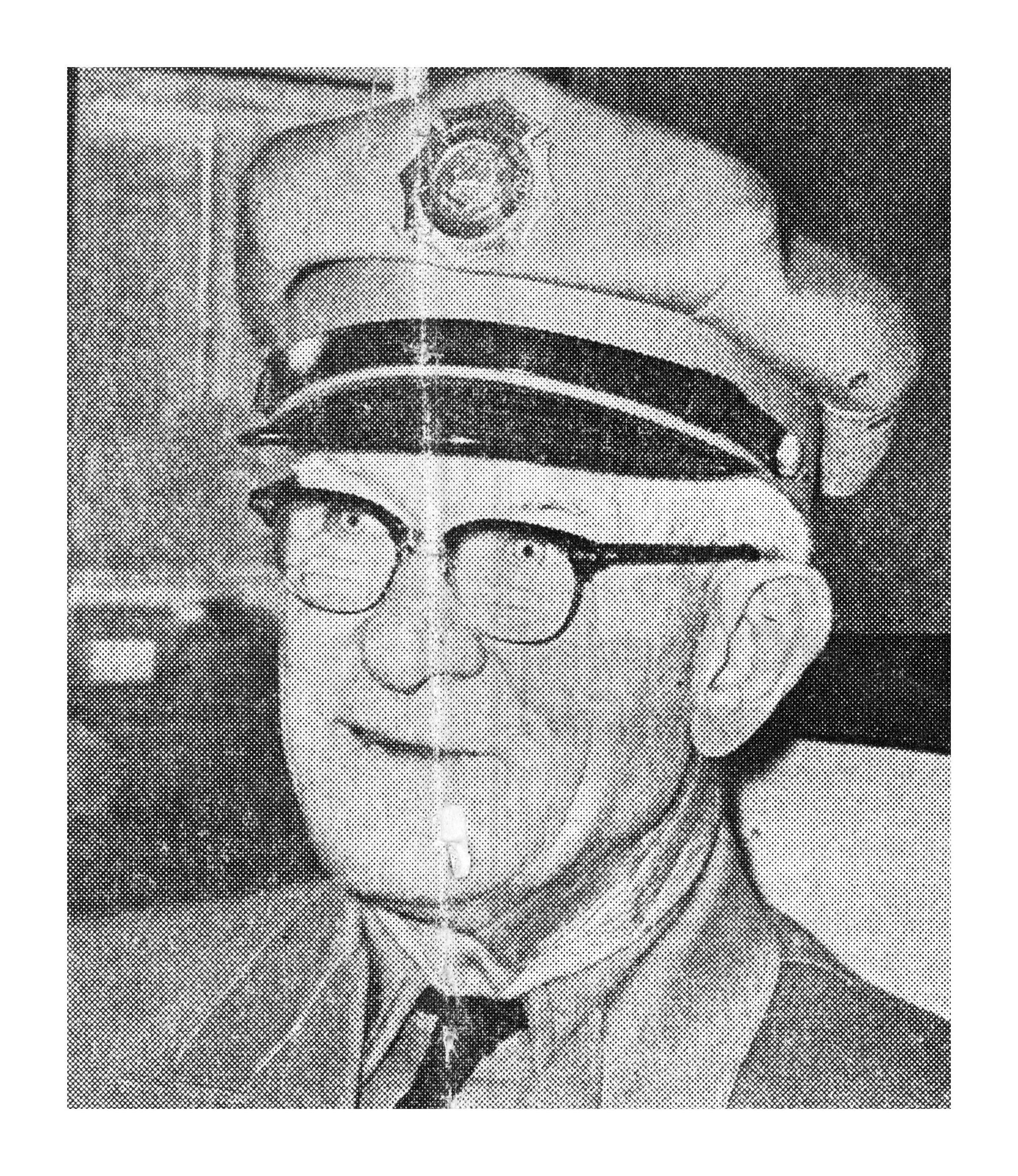 Black and white portrait of an unidentified older tollbooth worker. He is wearing black-framed glasses and a tollbooth hat.